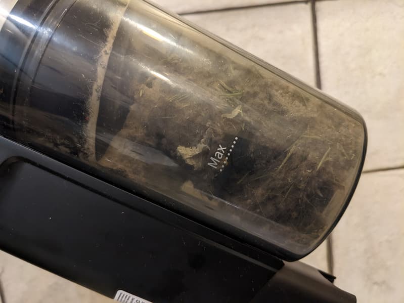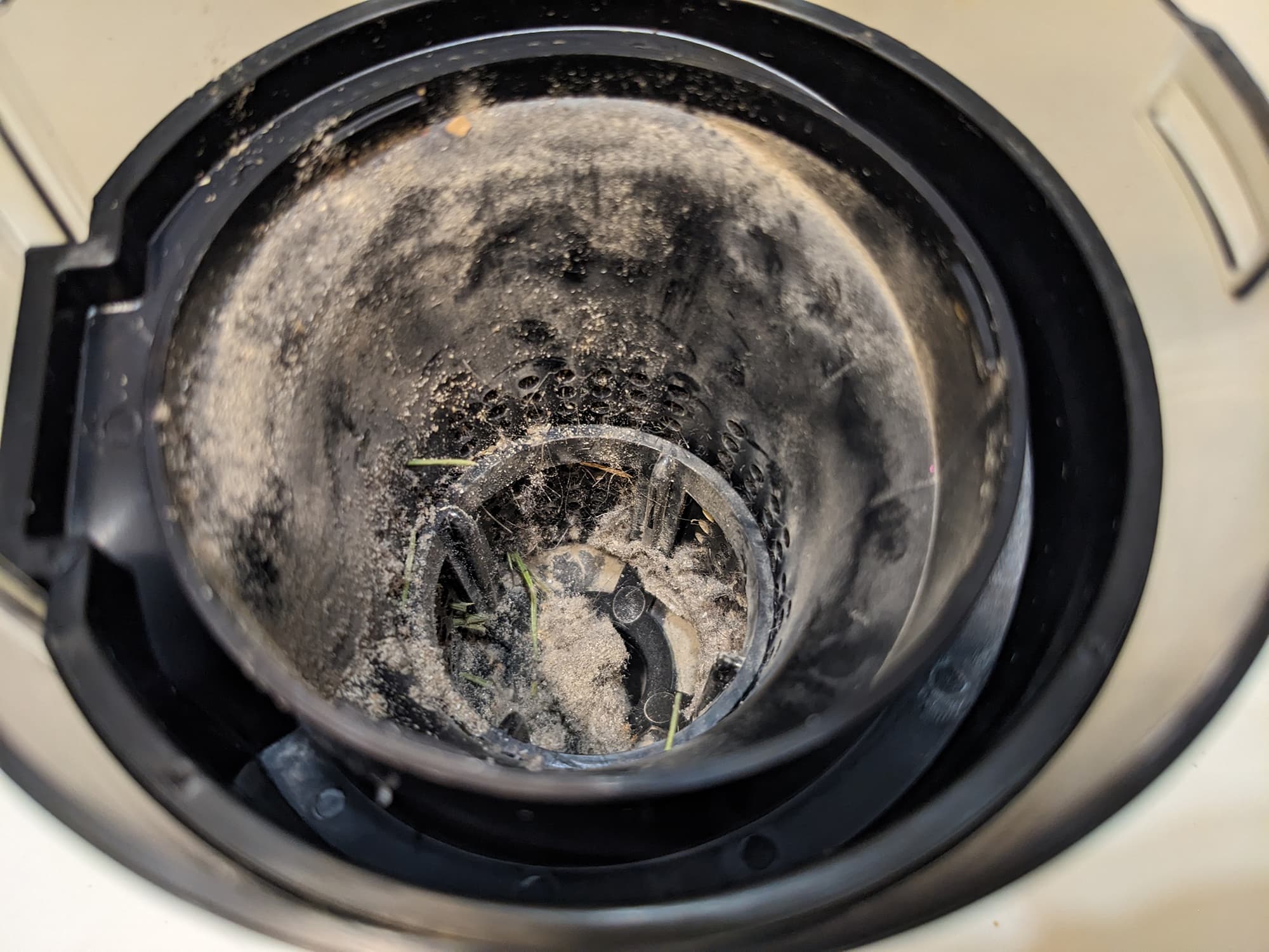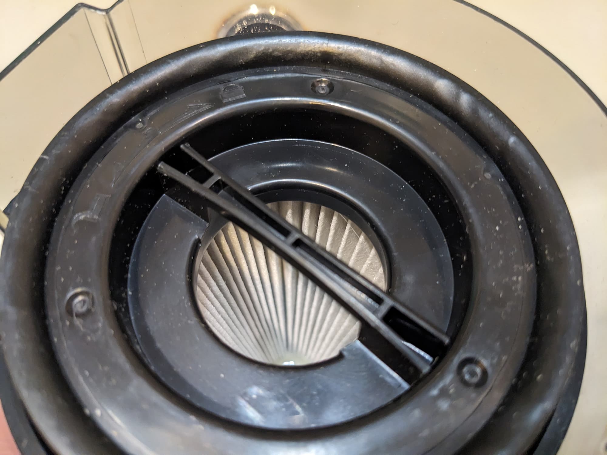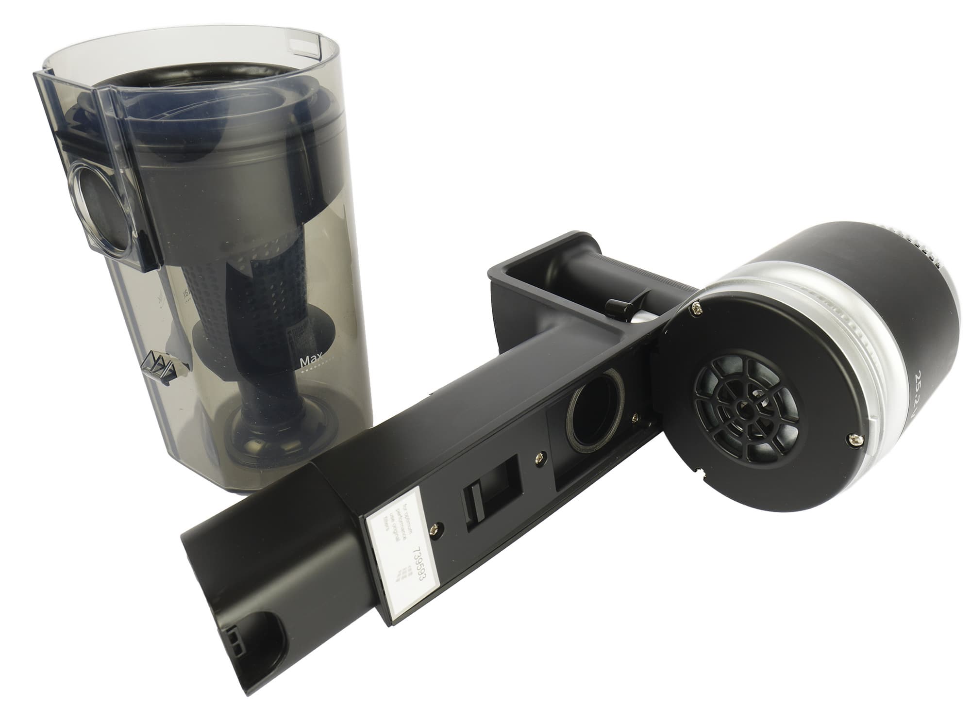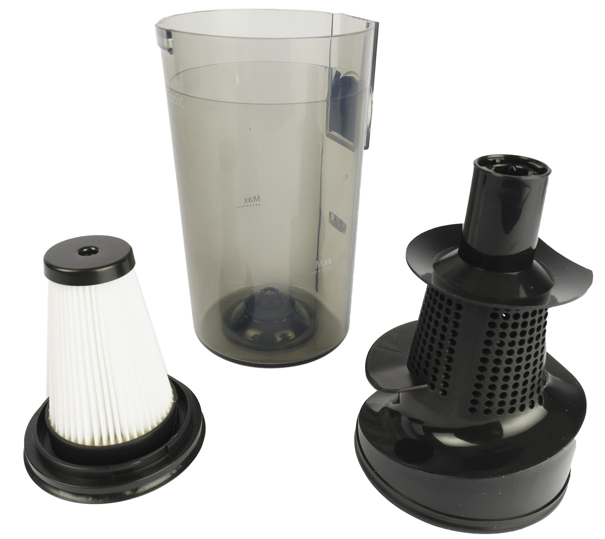 «Стакан» мусоросборника выполнен из темно-серого полупрозрачного пластика. В нем стоит несложный циклонный элемент, внутри которого — HEPA-фильтр в форме усеченного конуса, отвечающий за тонкую очистку.