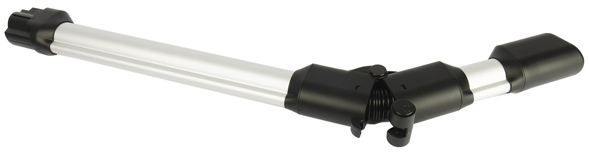 В средней части трубки — шарнир, позволяющий изогнуть ее на 90°: благодаря такой конструкции существенно легче убирать под шкафами и диванами. Подвижное соединение фиксируется защелкой, которой управляет пластиковая кнопка.