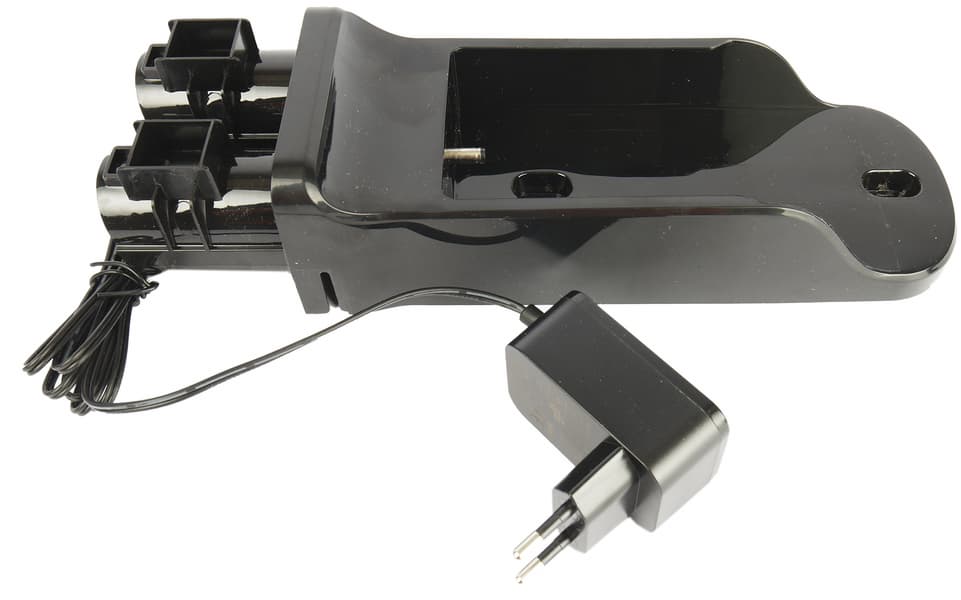 Настенное крепление выполнено из черного пластика и снабжено двумя креплениями для щелевых насадок. Разъем адаптера постоянного тока (32 В, 0,45 А) прикреплен к базе, но при желании его можно отстегнуть и подключить к пылесосу или аккумулятору напрямую.