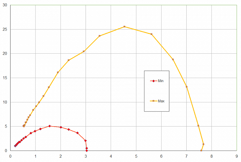 Измеренное нами значение составило 26 аВт в максимальном режиме и 5 аВт в минимальном.