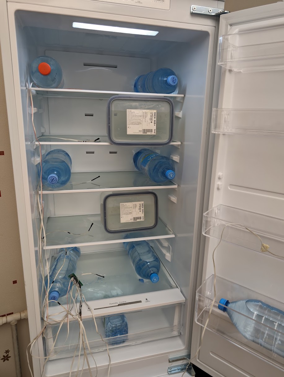 Помимо датчиков температуры воды использовались датчики температуры воздуха. Их мы поместили рядом с контейнерами — так, чтобы поверхность сенсоров не контактировала напрямую с элементами корпуса морозильной камеры.