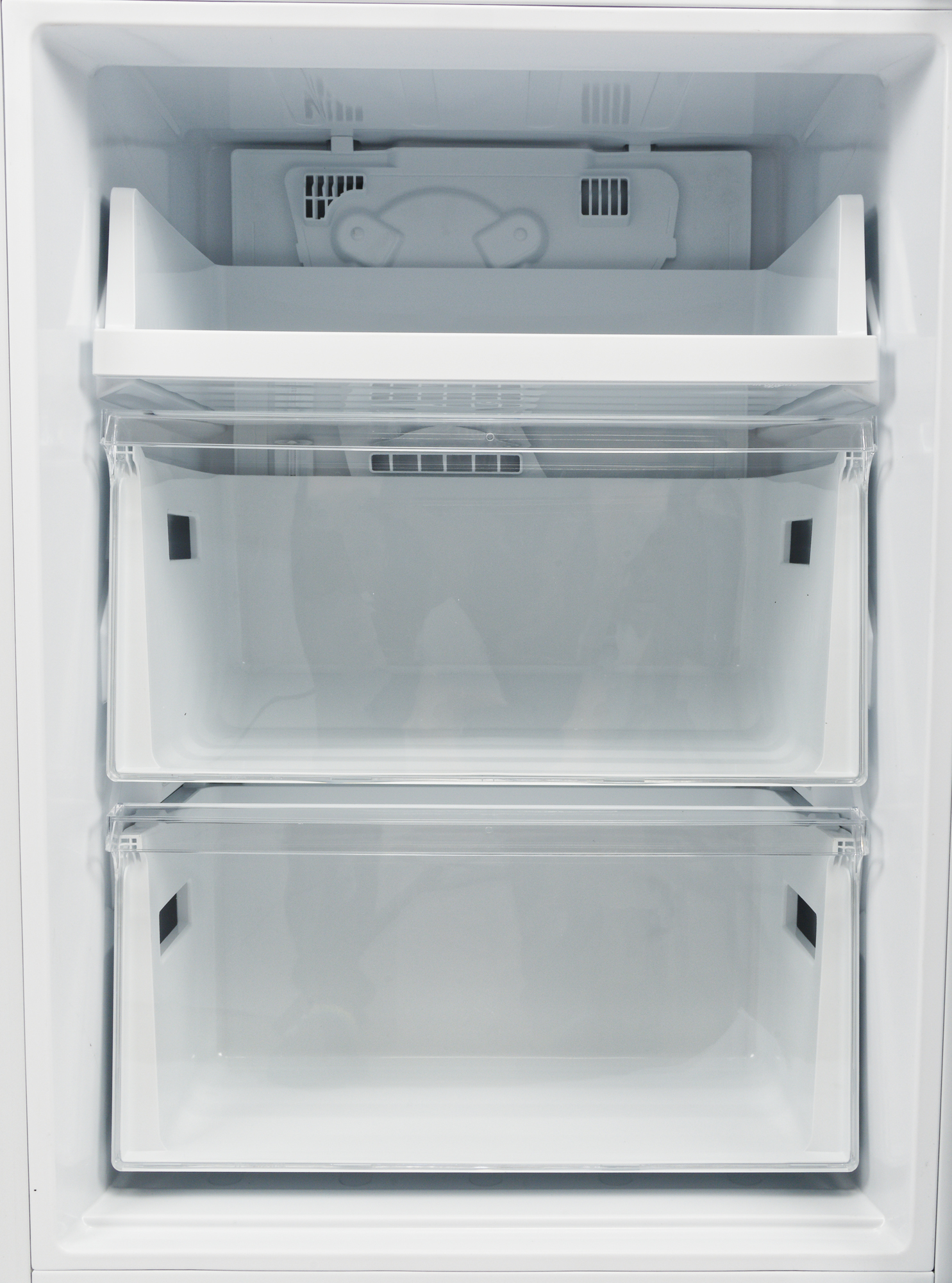 В морозильном отделении — два ящика с прозрачными передними стенками и одна полка, размещенная над ними. У ящиков одинаковая высота, но разная глубина: за нижним скрывается ниша холодильного агрегата.