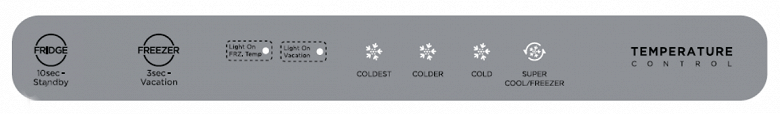 Все надписи на панели — на английском языке. За установку температуры в холодильном отделении отвечает кнопка «Fridge», а за морозилку — «Freezer».