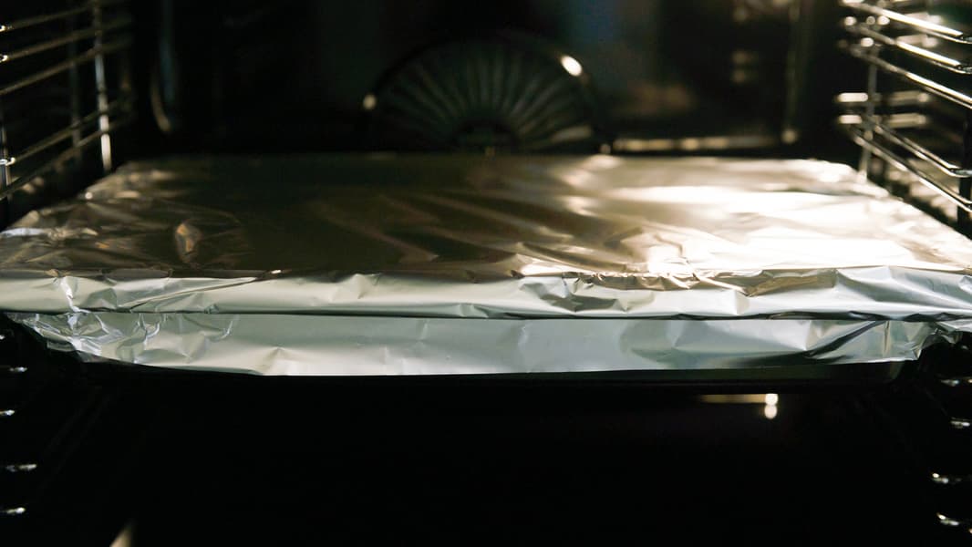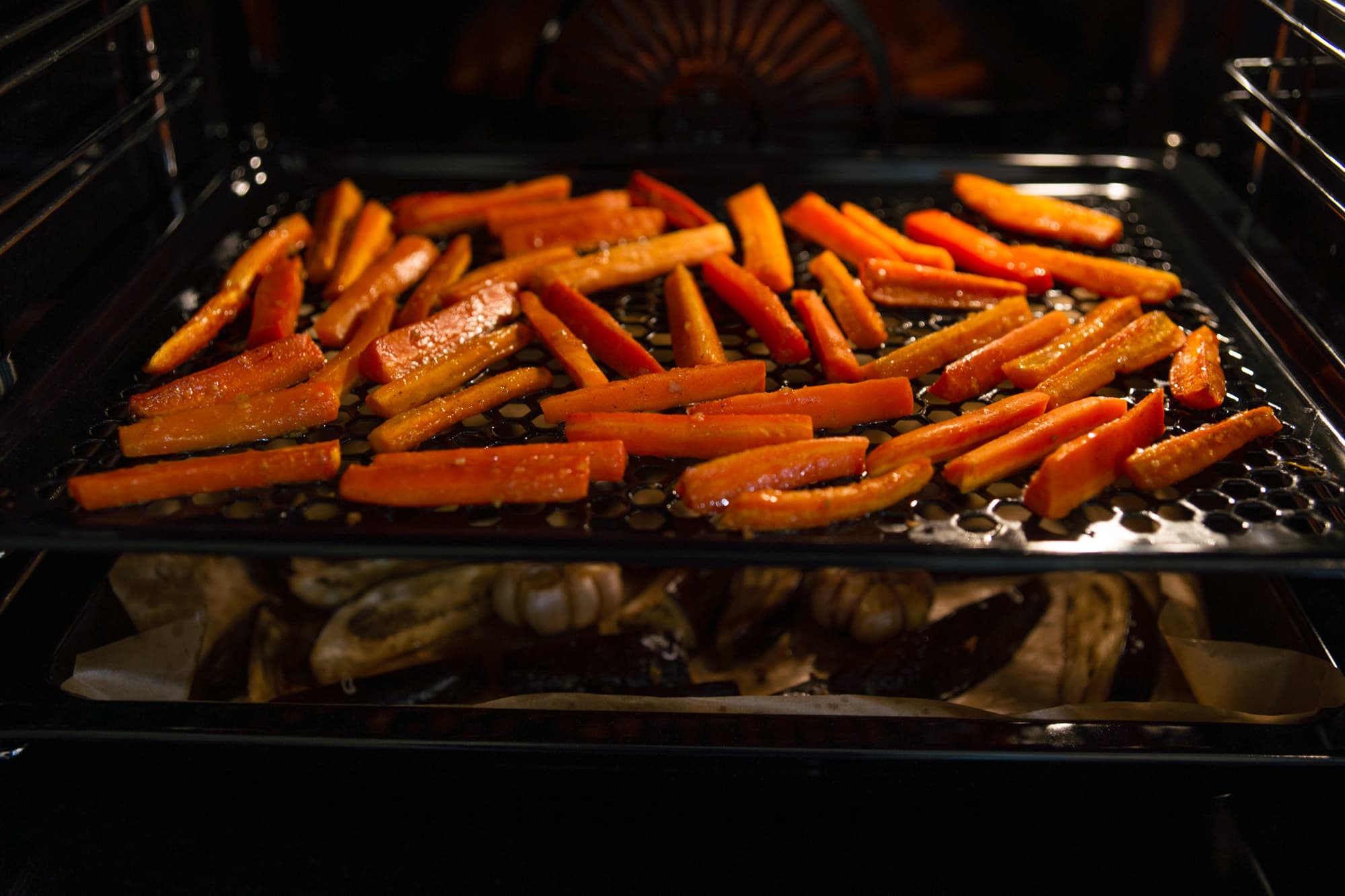 На противень с баклажанами и чесноком поставили предварительно смазанный маслом противень Fryart с морковью и разместили их на одном уровне, укрыв фольгой.