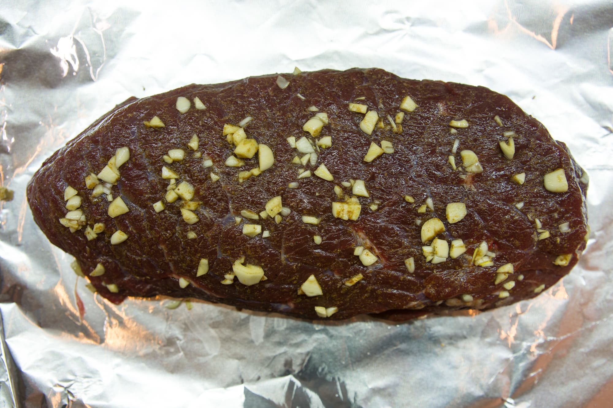 Для первого теста мы взяли кусок филейной части говяжьей туши весом почти полтора килограмма. Смазали мясо оливковым маслом, натерли смесью соли, сухого розмарина и тимьяна, густо присыпали черным молотым перцем, растерли его по поверхности куска со всех сторон и вдавливающими движениями, также со всех сторон распределили крупно нарезанный чеснок. Всю эту ароматную красоту замотали в фольгу и оставили при комнатной температуре примерно на час.