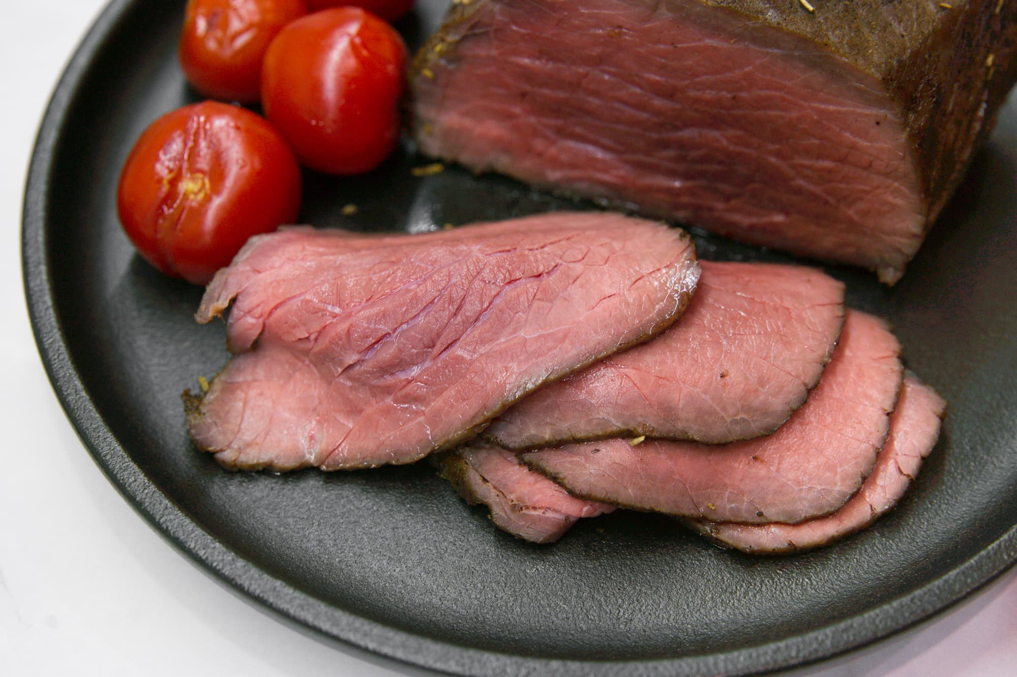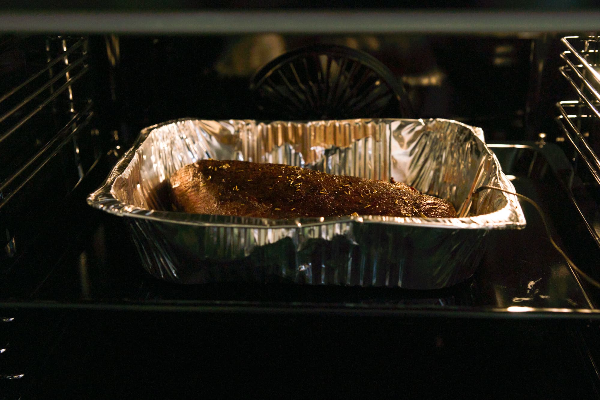Форму мы не накрывали, в середине процесса перевернули мясо для равномерности запекания. Как только раздался сигнал термощупа, достали форму, накрыли ее фольгой и оставили на столе, дав мясу отдохнуть.