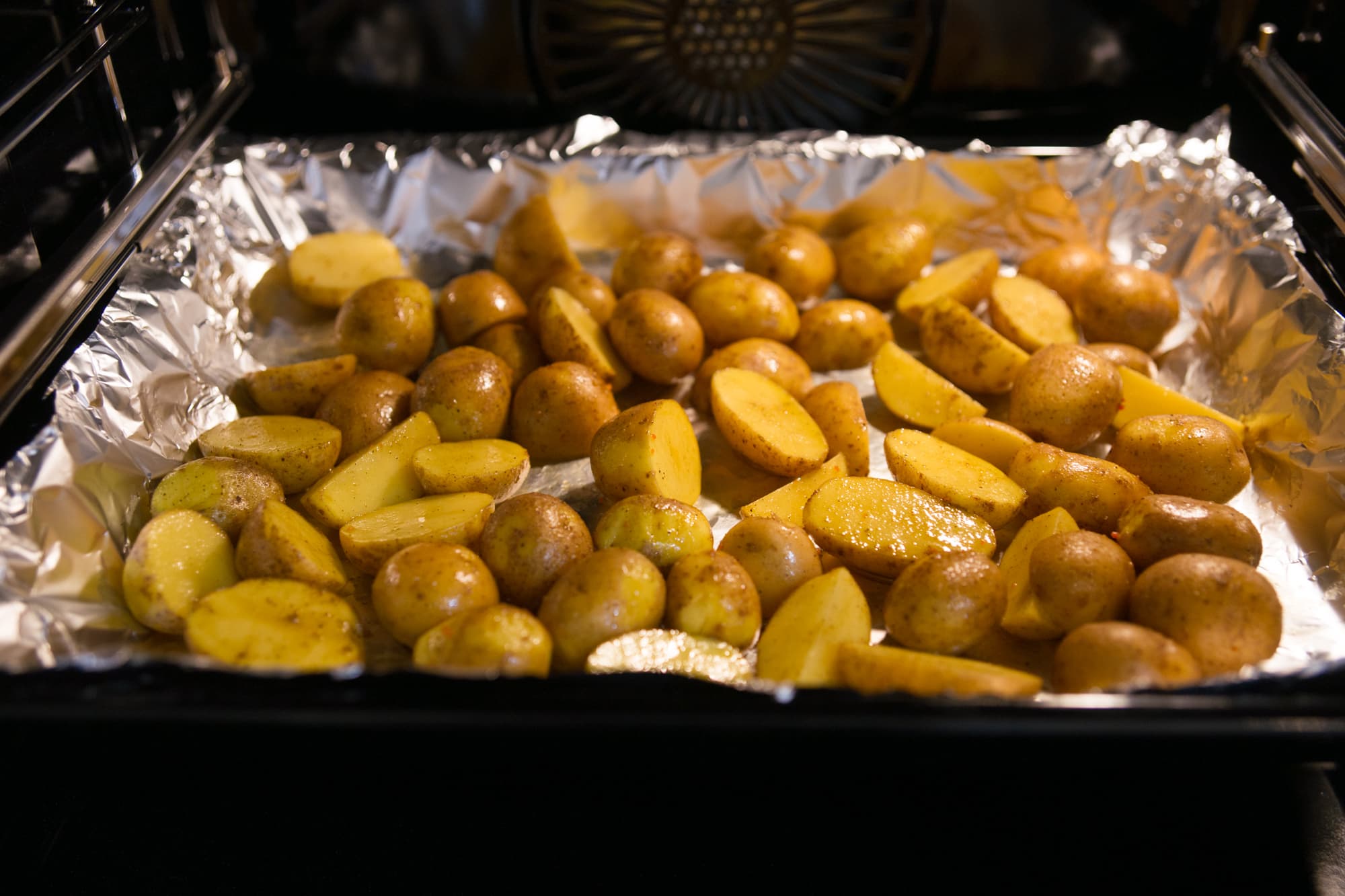 Духовка нагрелась до 180 °C в режиме верх+низ с конвекцией. На нижний противень разложили 1,5 кг картофеля.