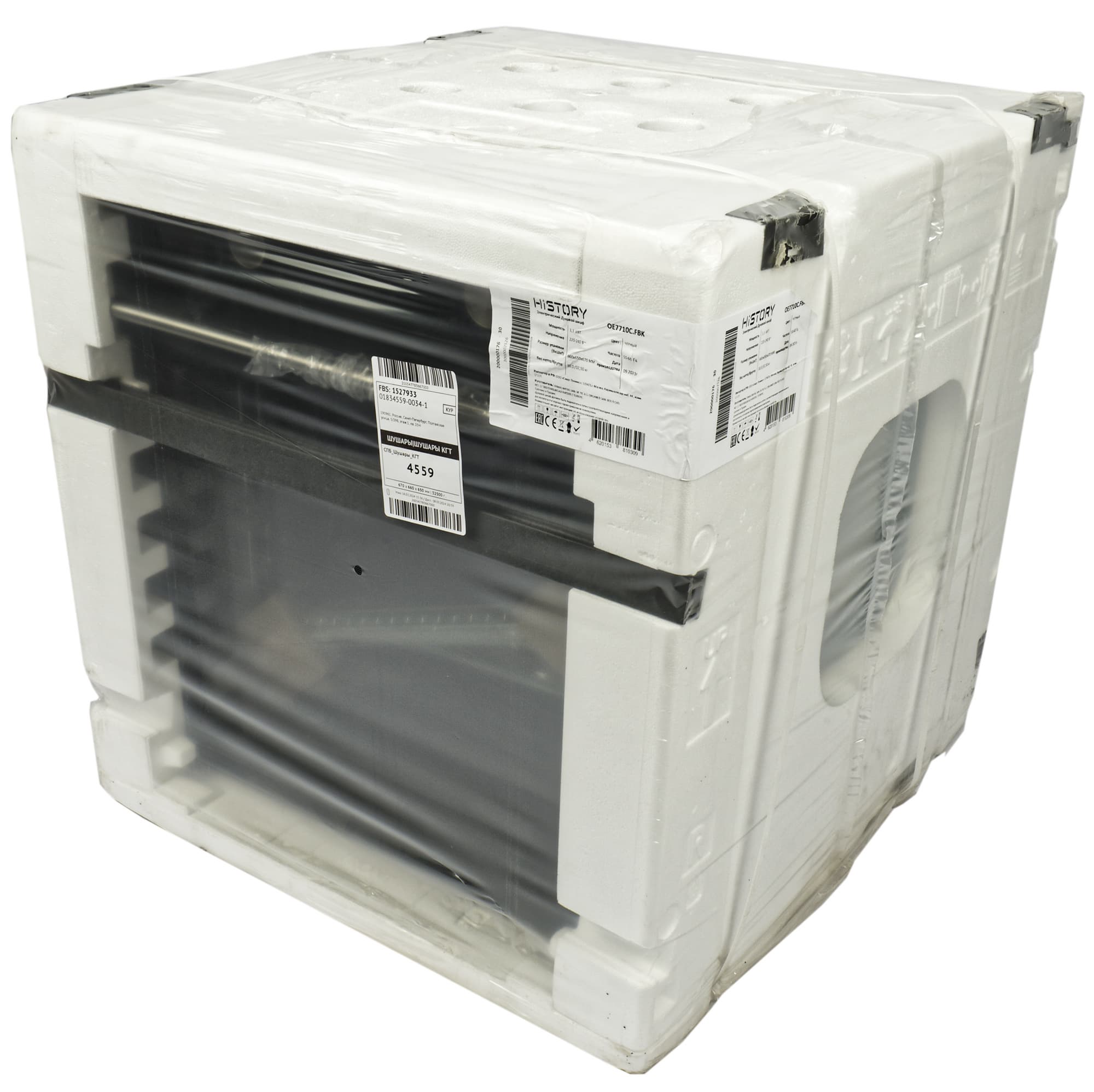 Духовой шкаф History OE7710C.FBK поставляется в коробе из пенопласта, обтянутого прочным полиэтиленом. На упаковке размещена наклейка с краткой информацией о модели.