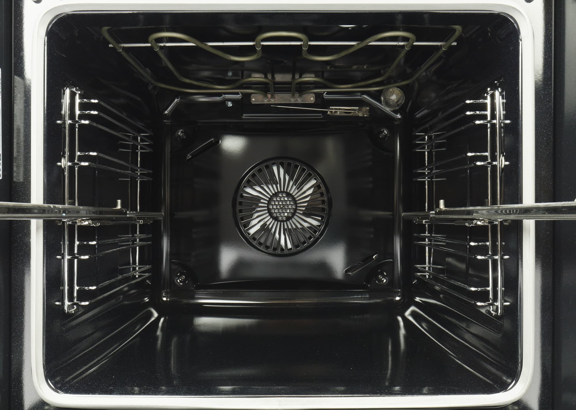 Стенки вместительной 77-литровой камеры покрыты эмалью. Вверху расположен тэн гриля, по центру задней стенки — вентилятор конвекции с кольцевым нагревательным элементом, а в правом дальнем углу сверху находится лампочка мощностью 25 Вт. На стенках — съемные решетки, позволяющие размещать противни на 6 уровнях.