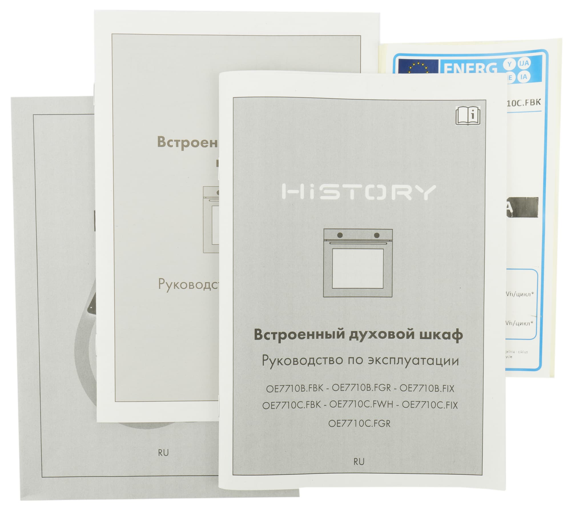 Комплект документов History OE7710C.FBK состоит из: руководства по эксплуатации, отдельной инструкции к противню FryArt, руководства по установке и наклейки об энергоэффективности.