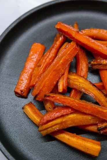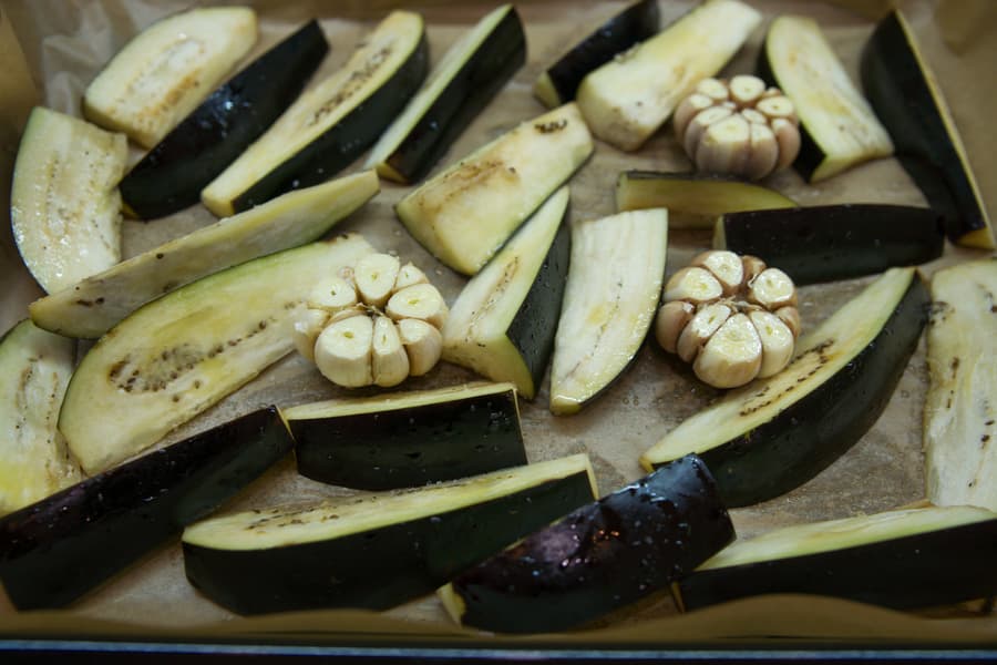 Пока овощи запекались, подготовили мед с мускатным орехом и корицей. Через 30 минут достали поддон с морковью, окунули каждый кусочек в медовую смесь и вернули на противень. Фольгу убрали, а баклажаны переставили на уровень ниже. Переключили режим на большой гриль и продержали овощи в духовке еще около 20 минут.