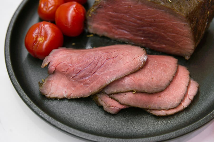 Температура внутри минут за 10 дошла до 58 °C и остановилась. Результат превосходный: мясо получилось очень нежным и сочным. В холодном виде оно становится еще вкуснее.