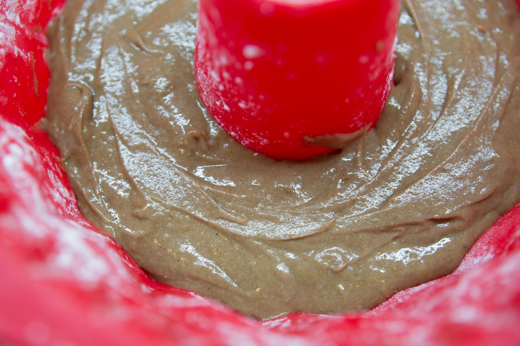 В отдельной емкости смешали просеянную муку, разрыхлитель, соль и смесь корицы, кардамона, мускатного ореха и имбиря. Размягченное сливочное масло взбили с сахаром. Постепенно добавляя по яйцу, добились воздушной массы, влили молоко, добавили все сухие ингредиенты и хорошенько перемешали. Тесто вышло глянцевым, густым и тягучим. Духовка в режиме верх+низ к этому моменту разогрелась до 160 °C.