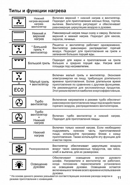 Основная инструкция содержит максимум необходимой информации, касающейся повседневного использования. Главы документа посвящены устройству духовки, детальному описанию нюансов управления и режимов приготовления, мерам безопасности, а также правилам по уходу. Последние две страницы отведены под гарантийный талон.