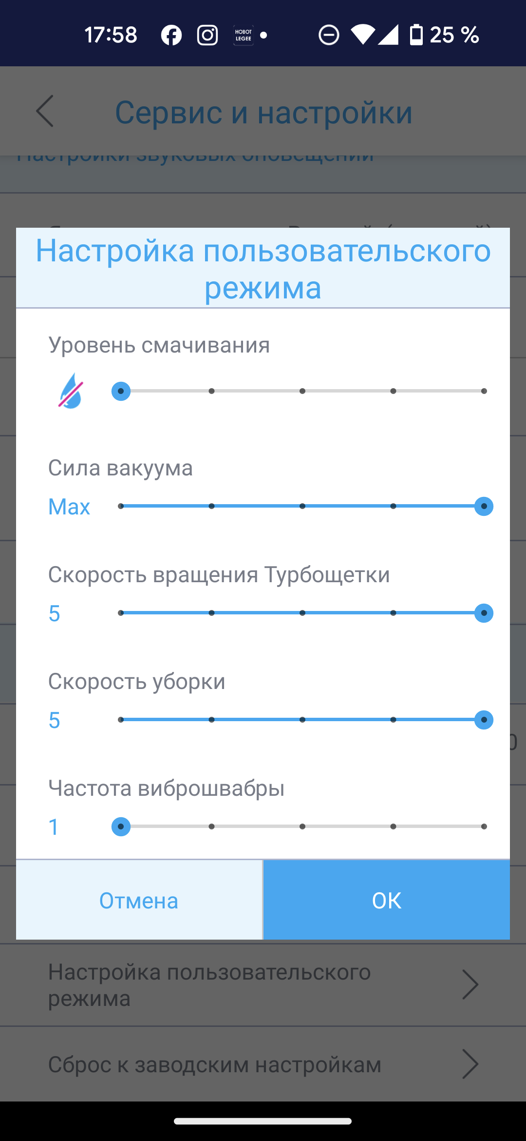 Пользовательский режим предусматривает настройку интенсивности влажной уборки, силы всасывания, скорости вращения турбощетки, скорости движения устройства и частоты перемещений виброшвабры.