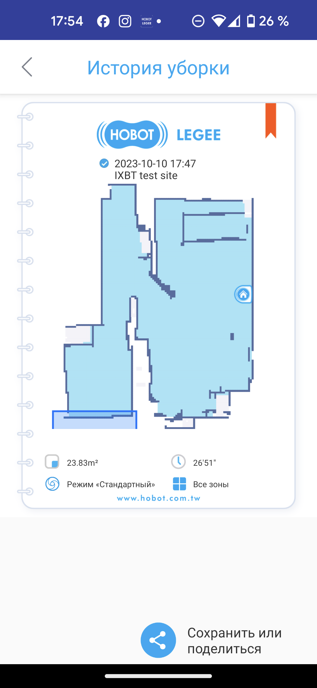 Раздел «История уборки» позволяет ознакомиться с журналом запусков. Здесь доступна информация об убранной площади, продолжительности работы, использованном режиме уборки и маршруте движения устройства.
