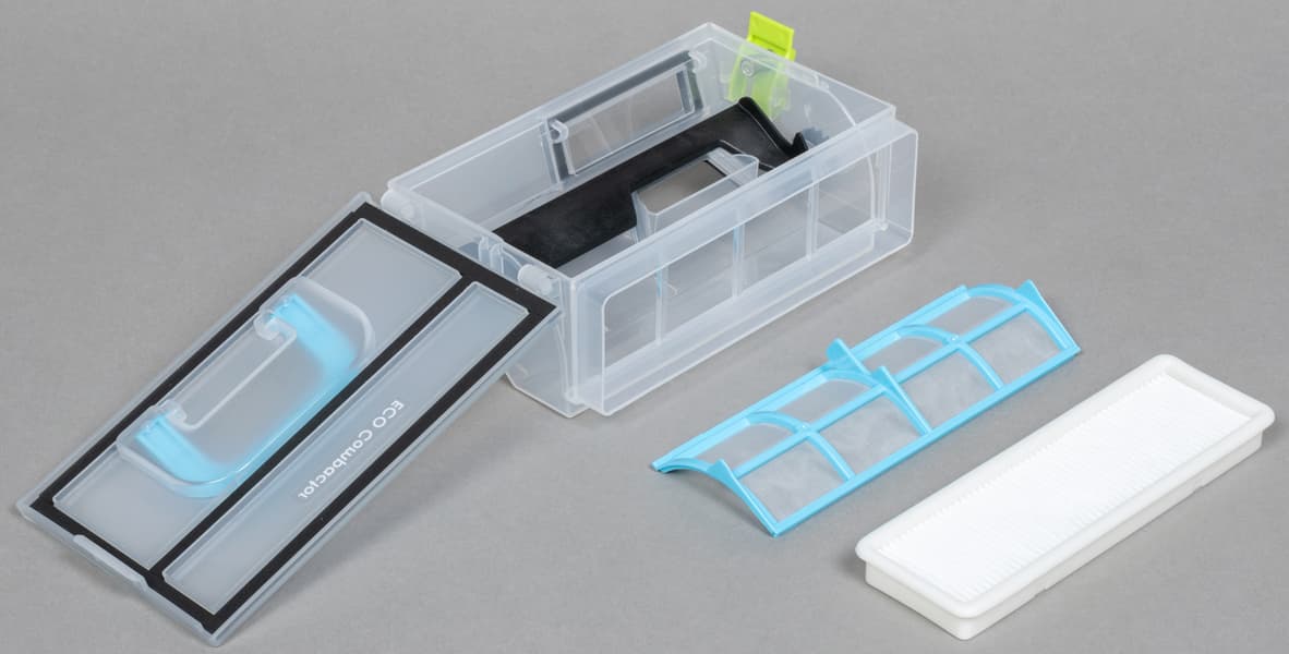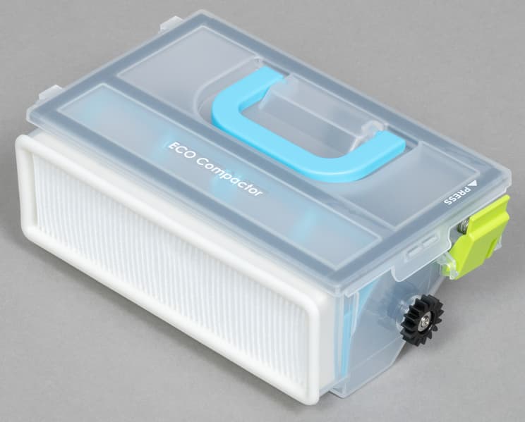 Полупрозрачная емкость снабжена системой трамбовки мусора: несложный пластиковый механизм уплотняет собранное, что позволяет увеличить вместимость контейнера и, следовательно, время автономной работы.