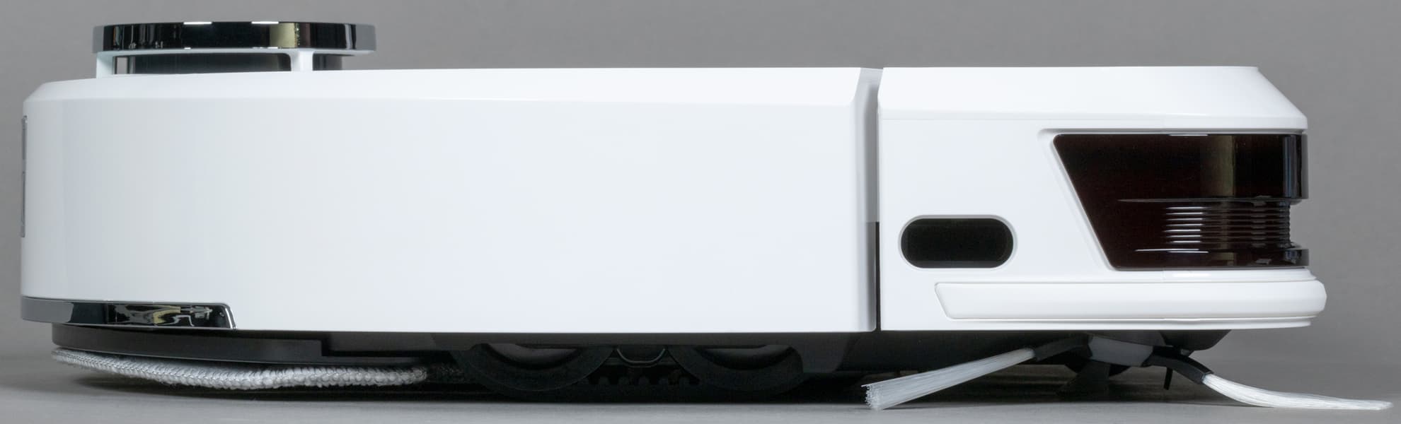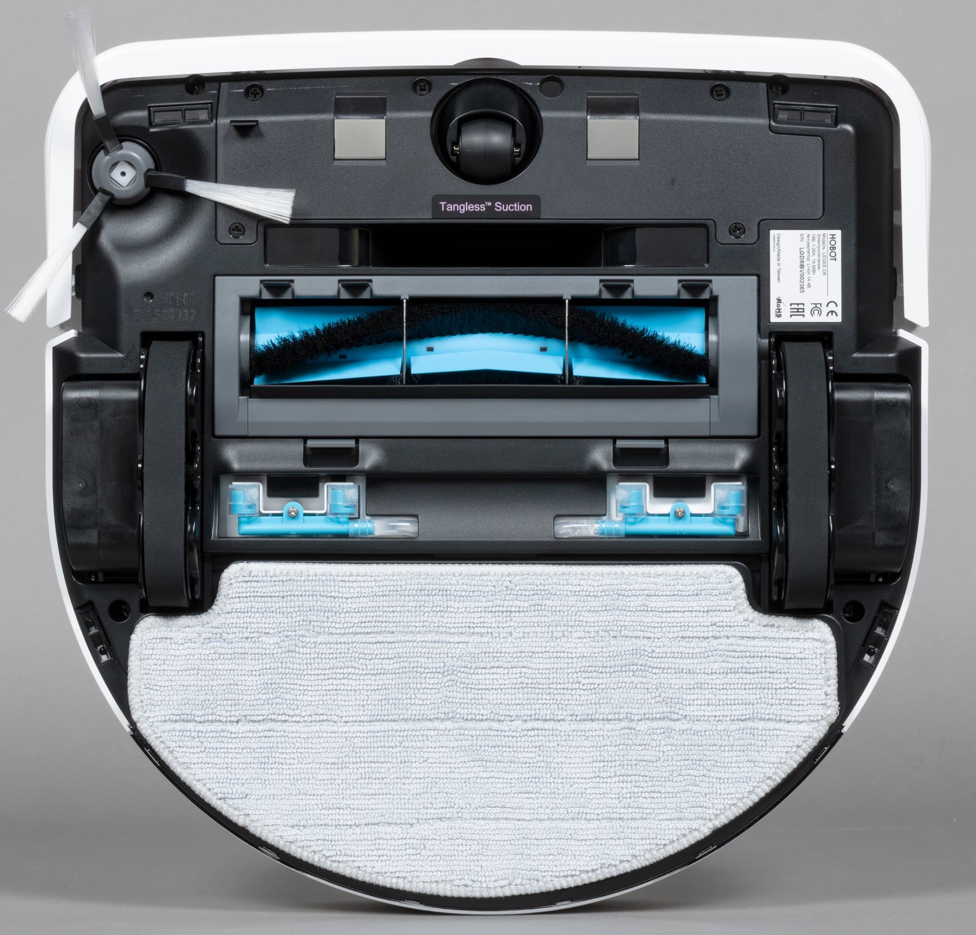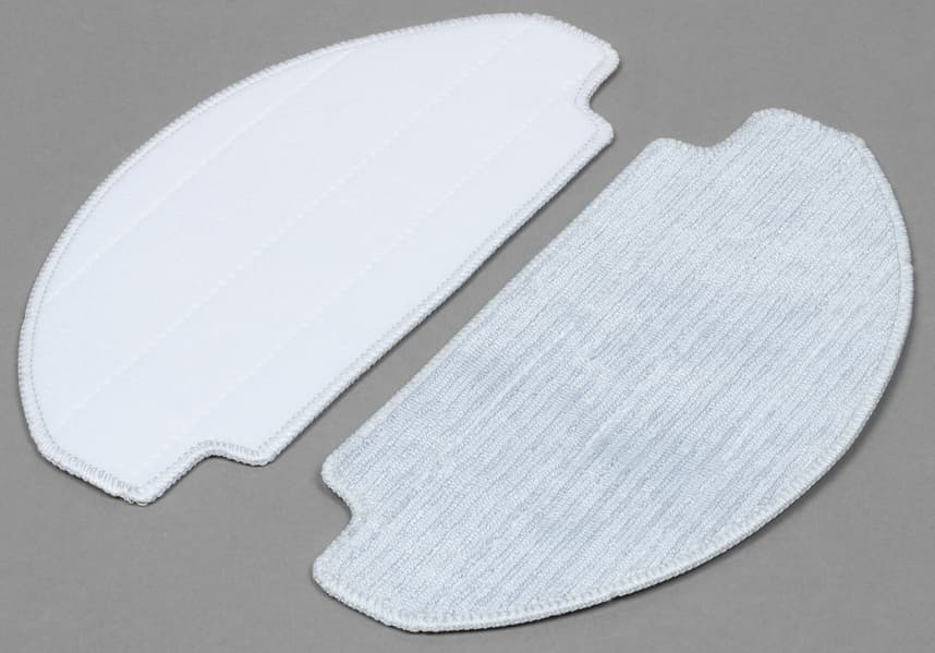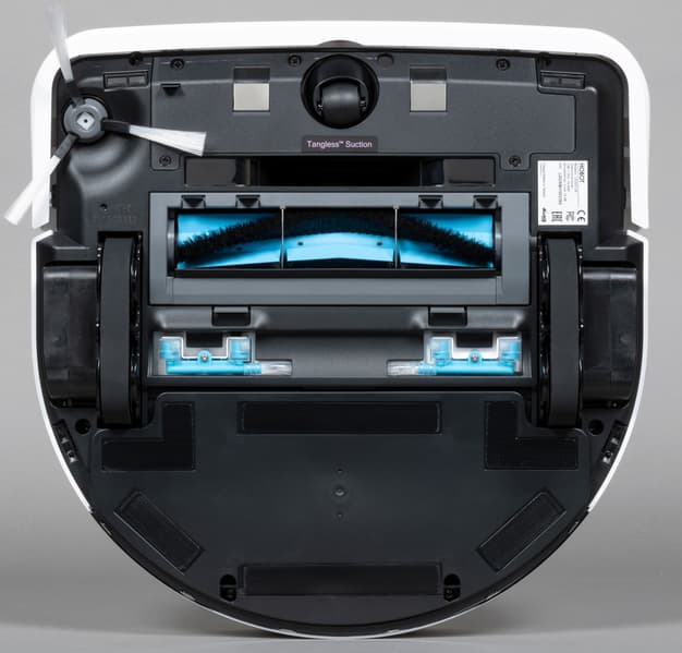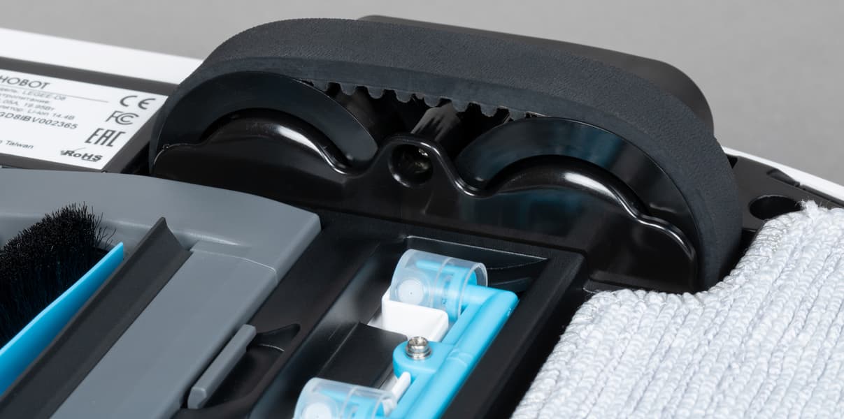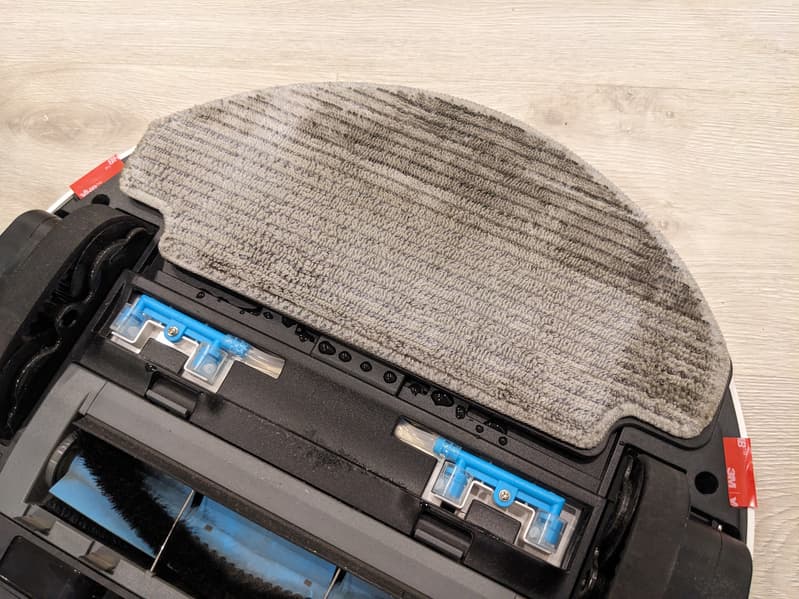 Всю заднюю половину нижней панели занимает D-образная швабра, к которой с помощью липучек-велкро крепятся фибровые салфетки. Она подвижная: в процессе уборки с высокой (до 1300 движений в минуту) вибрирует в направлении вперед-назад, что значительно увеличивает эффективность мытья пола. При преодолении препятствий и въезде на ковровые покрытия конструкция может приподниматься на высоту до 7 мм от поверхности: это улучшает проходимость и предотвращает избыточное смачивание мягких покрытий. При автоматическом распознавании ковра робот, разумеется, отключает и распыление воды.