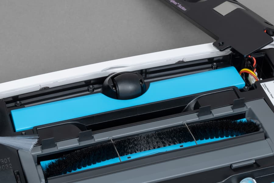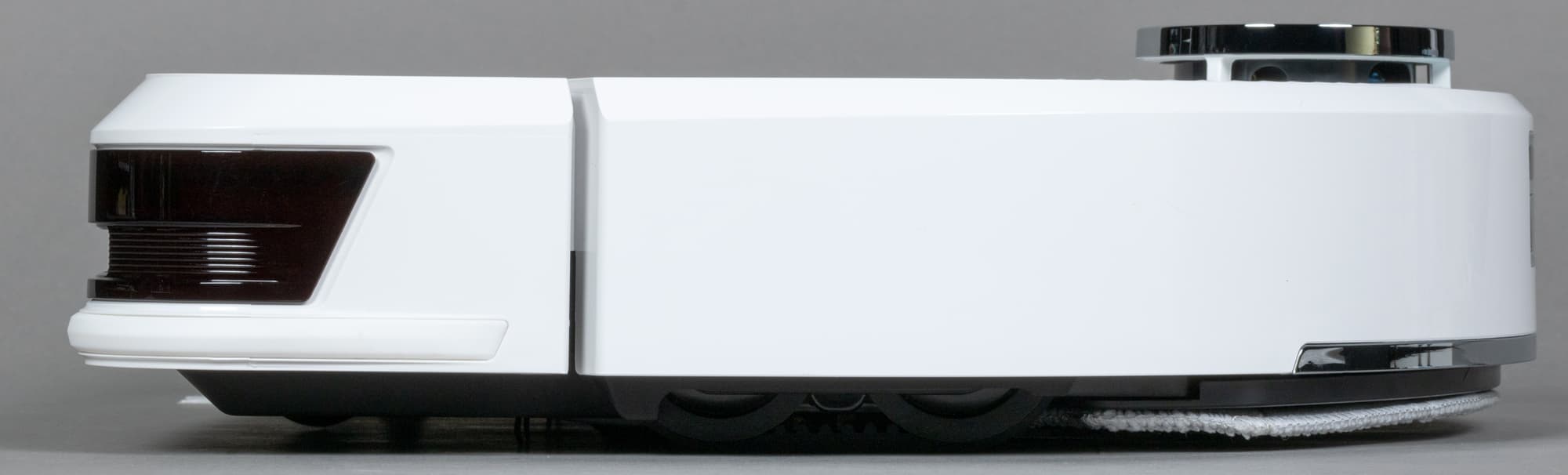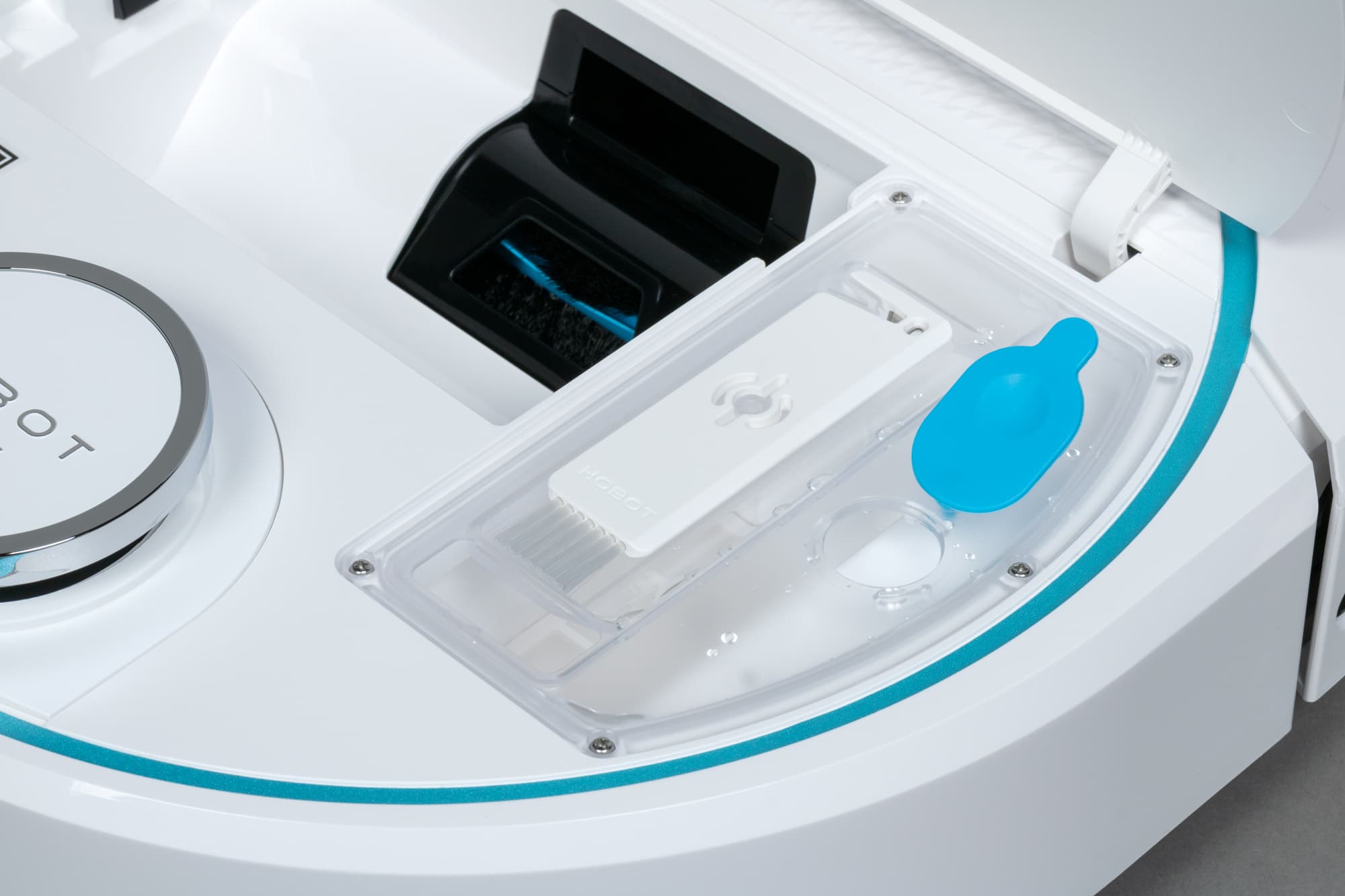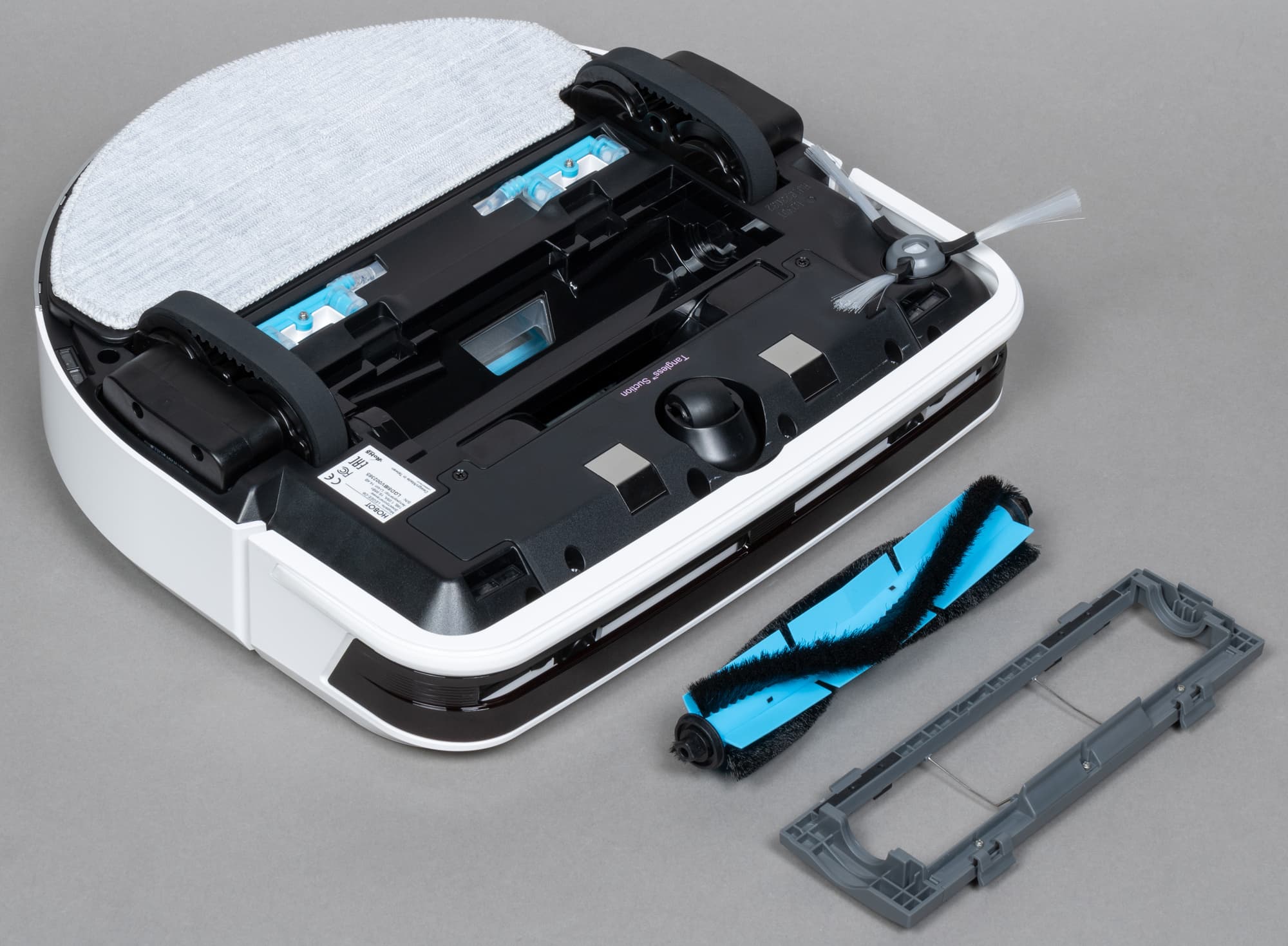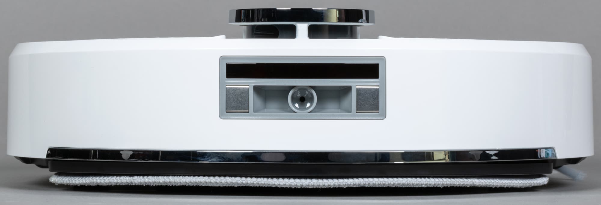 Всю заднюю половину нижней панели занимает D-образная швабра, к которой с помощью липучек-велкро крепятся фибровые салфетки. Она подвижная: в процессе уборки с высокой (до 1300 движений в минуту) вибрирует в направлении вперед-назад, что значительно увеличивает эффективность мытья пола. При преодолении препятствий и въезде на ковровые покрытия конструкция может приподниматься на высоту до 7 мм от поверхности: это улучшает проходимость и предотвращает избыточное смачивание мягких покрытий. При автоматическом распознавании ковра робот, разумеется, отключает и распыление воды.