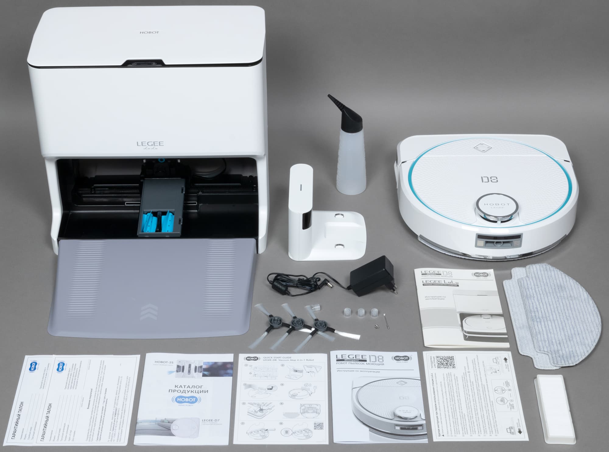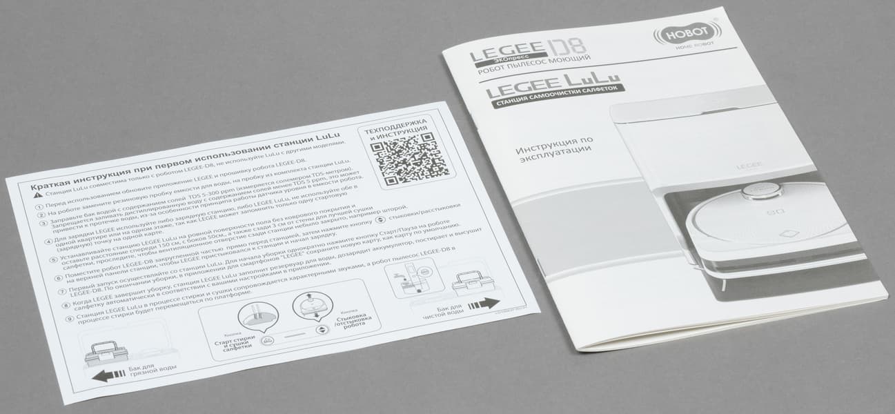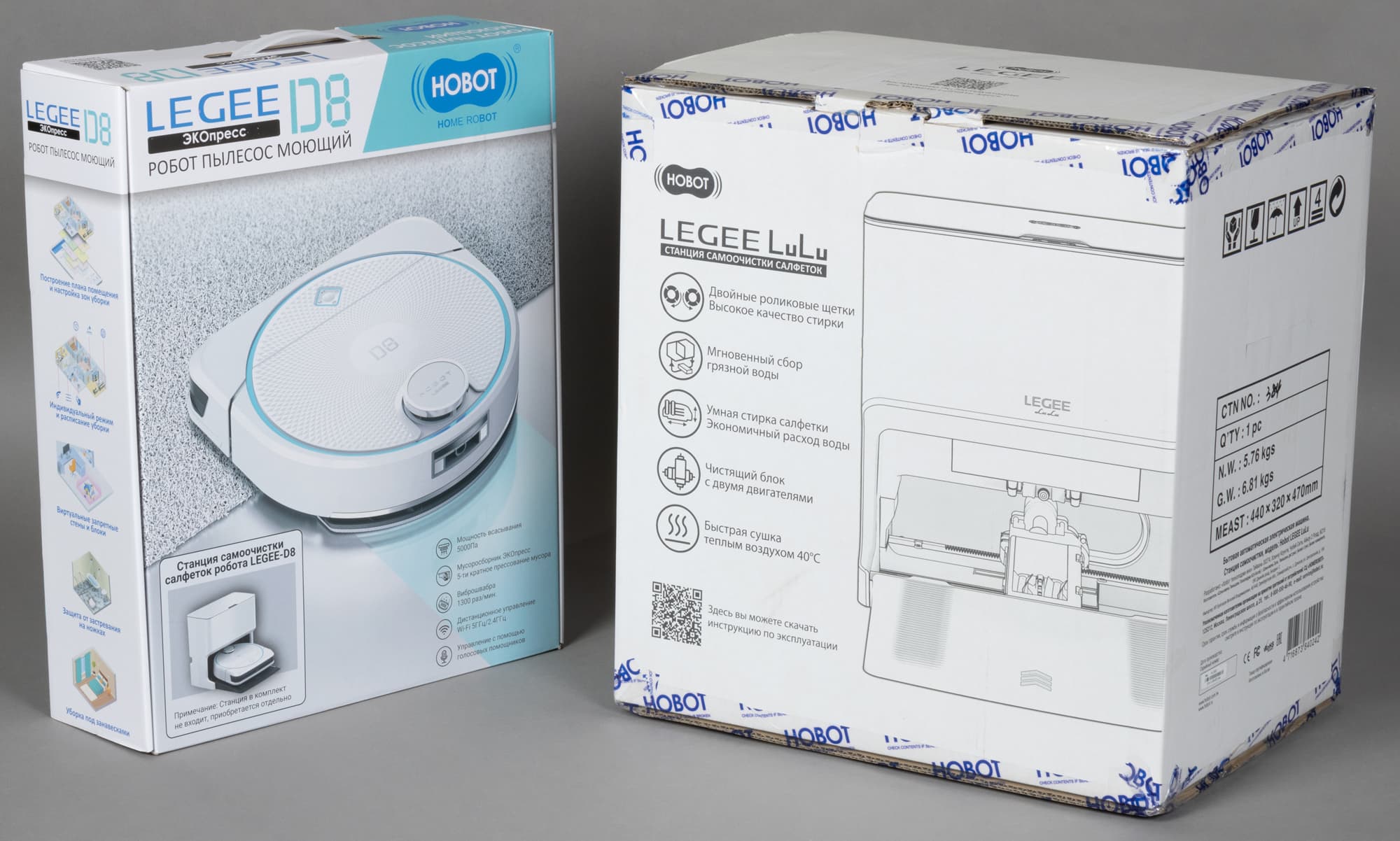 Робот-пылесос Hobot Legee D8 можно купить как отдельно, в традиционной конфигурации, так и в комплекте со станцией самоочистки салфеток LuLu. Пылесос и станция поставляются в двух коробках — так они и приехали к нам на тестирование.
