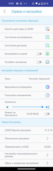В разделе «Сервис и настройки» пользователь может ознакомиться с состоянием датчиков прибора, проследить за уровнем заполнения резервуаров для чистой и грязной воды, настроить режим блокировки от детей, обновить прошивку или сбросить устройство к заводским установкам.