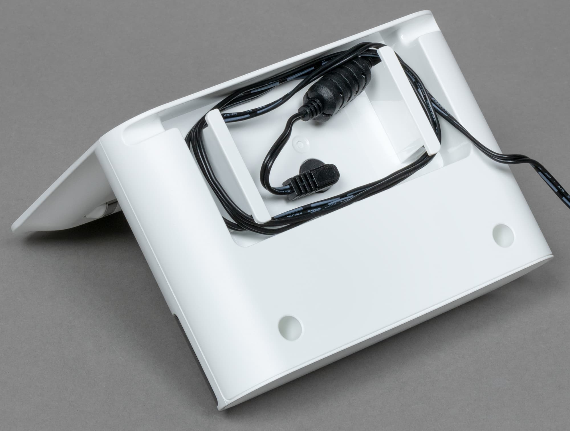 В задней части базы — разъем для подключения адаптера с отсеком для хранения излишков провода.