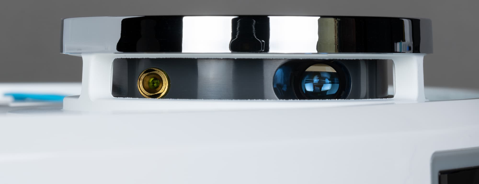 Ближе к «корме» из верхней панели поднимается башенка лидара, в которой вращается оптическая пара из лазерных излучателя и приемника. Это главный орган ориентирования робота, обеспечивающий ему точное и быстрое построение карты помещения.