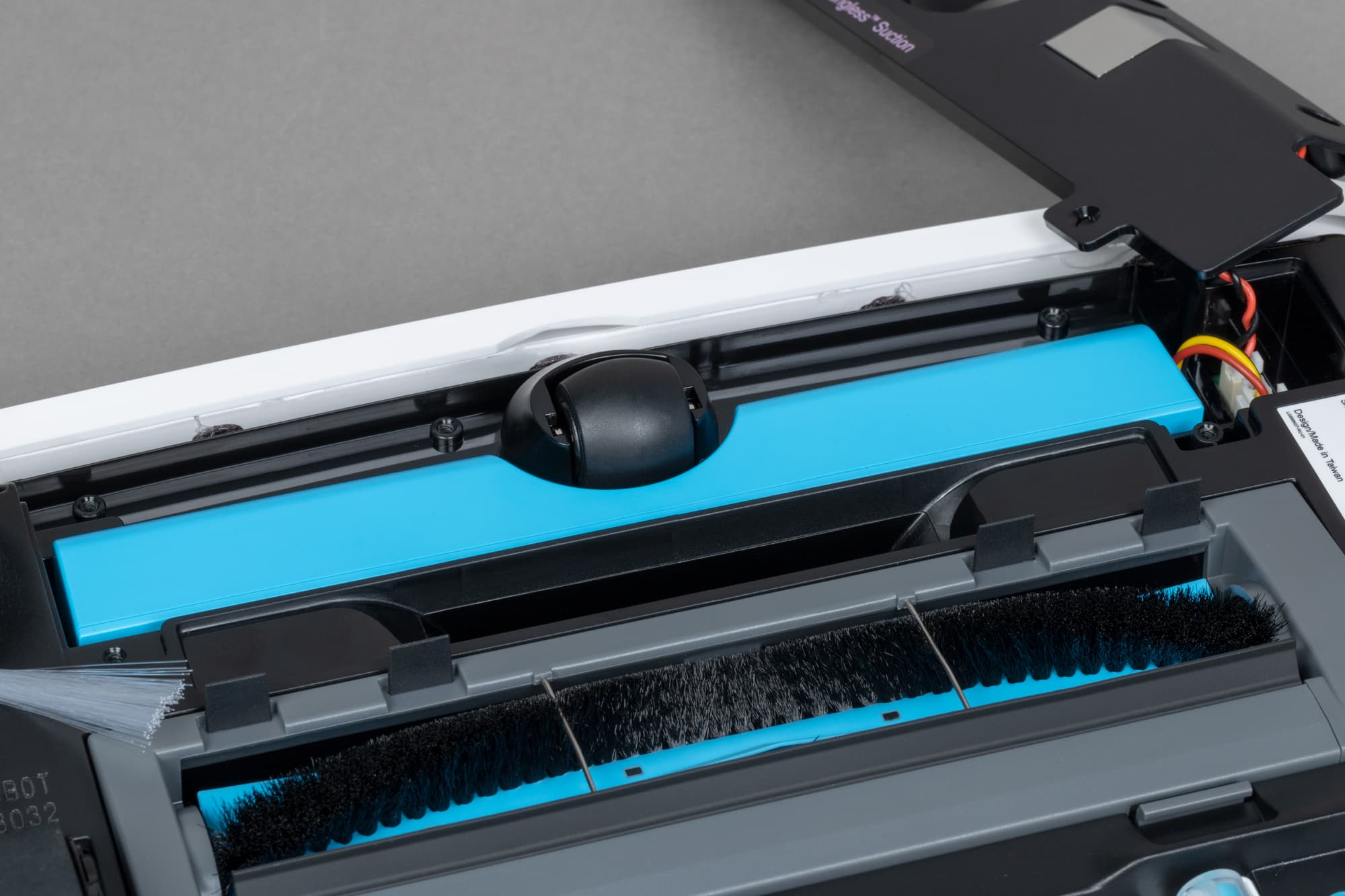 Единственная боковая щетка традиционной конструкции вращается в правом (если смотреть сверху) углу. Она крепится к оси с помощью защелки.