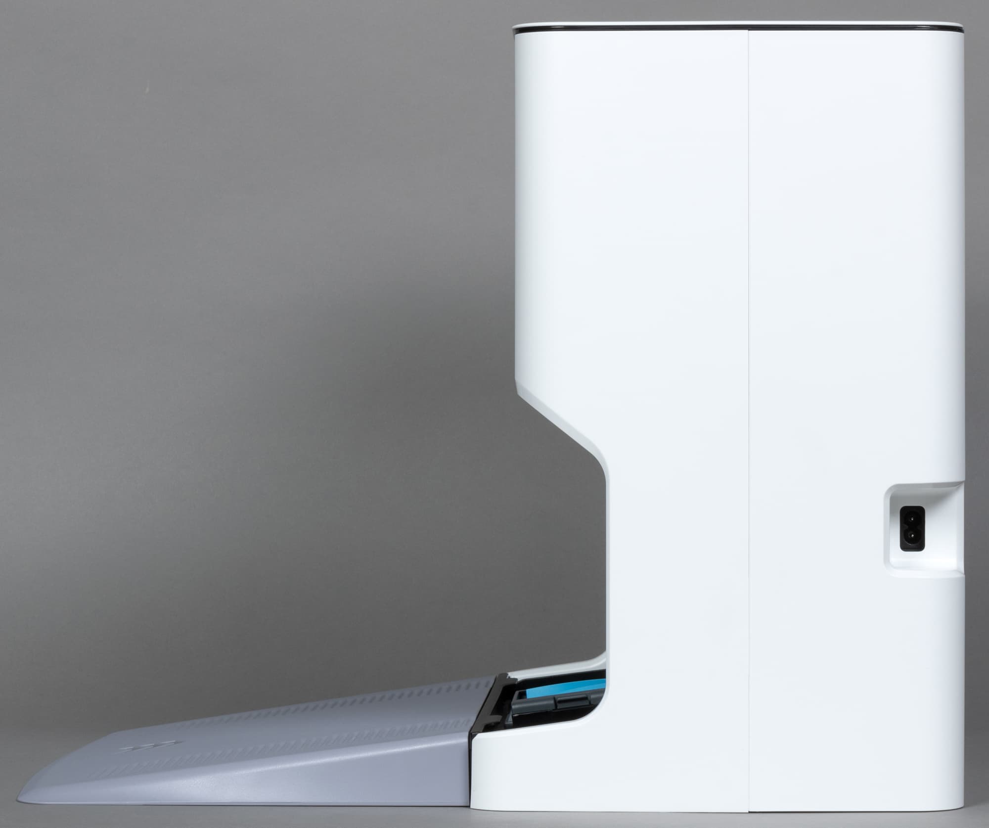 У входящей в комплект базы также вполне привычная конструкция. Ее верхняя часть сделана из ИК-прозрачного пластика. Под ним находятся датчики, облегчающие пылесосу поиск зарядной станции. Зарядка устройства производится с помощью двух подпружиненных металлических контактов на выносной консоли.