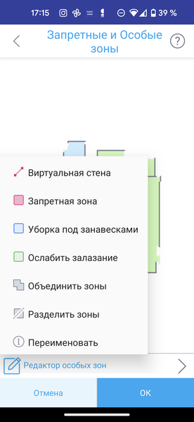 Свежесозданную карту приложение позволяет отредактировать: установить по своему вкусу границы помещений, объединяя, разъединяя или переименовывая комнаты. Здесь же можно выделить запретные для уборки зоны с помощью виртуальной стены или прямоугольной разметки. Приложение позволяет также пометить высокие пороги с помощью инструмента «ослабить залезание».