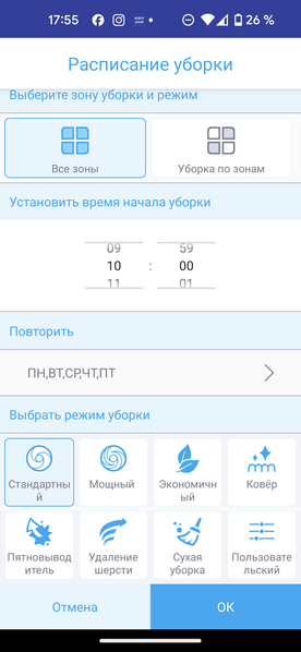 Настройки уборки по расписанию позволяет запланировать запуск пылесоса в одном из восьми режимов в нужный день и время суток.