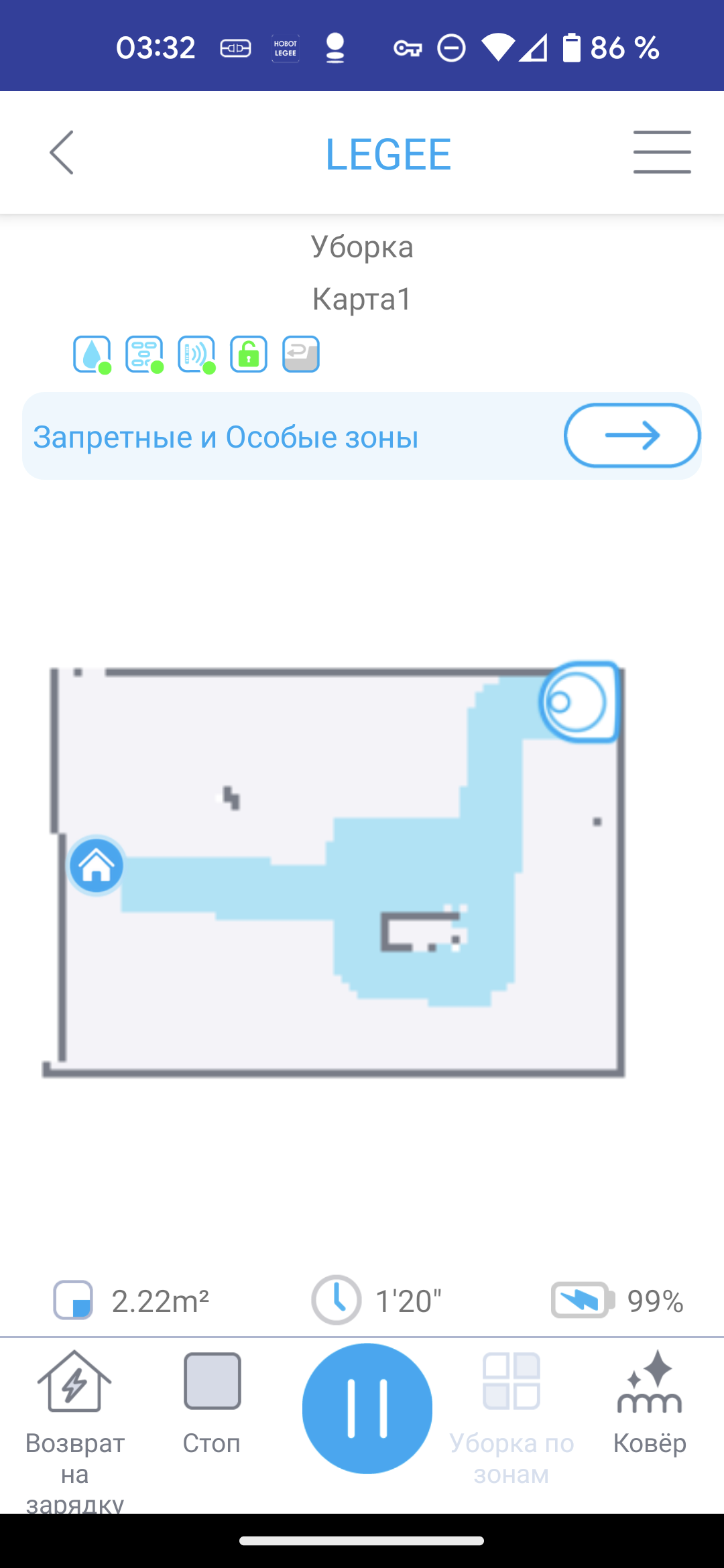- В режиме «Ковер» снижается скорость движения робота, а турбощетка вращается с высокой скоростью. Такой алгоритм позволяет достичь оптимального качества уборки мягких покрытий.