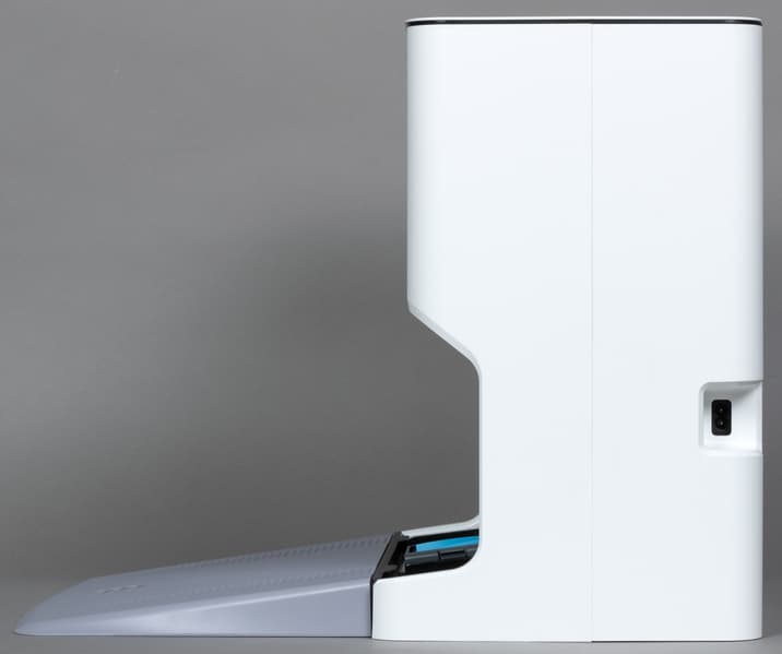 Закончив уборку, робот въезжает на аппарель станции, после чего запускается стирка . Расположенный под салфеткой подвижный модуль промывает салфетку чистой водой, а грязная переливается в предназначенную для нее емкость. Процесс требует времени: стирка занимает до пяти минут.