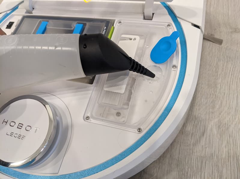 Как уже упоминалось, заряжаться наше устройство может как от традиционной зарядной станции, так и от системы самоочистки LuLu. Для начала работы с этим аксессуаром следует установить его на место базы, заполнить резервуар для чистой воды и заменить на пылесосе резиновую пробку: установленную по умолчанию затычку синего цвета сменить на входящую в комплект станции белую.