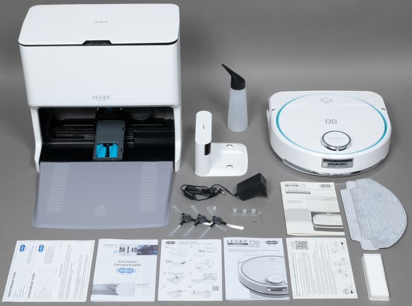 Комплектация у устройства богатая: производитель снабдил пылесос и станцию достаточным количеством расходных материалов — салфеток, фильтров и боковых щеток. О приобретении дополнительных аксессуаров пользователю придется задуматься нескоро.