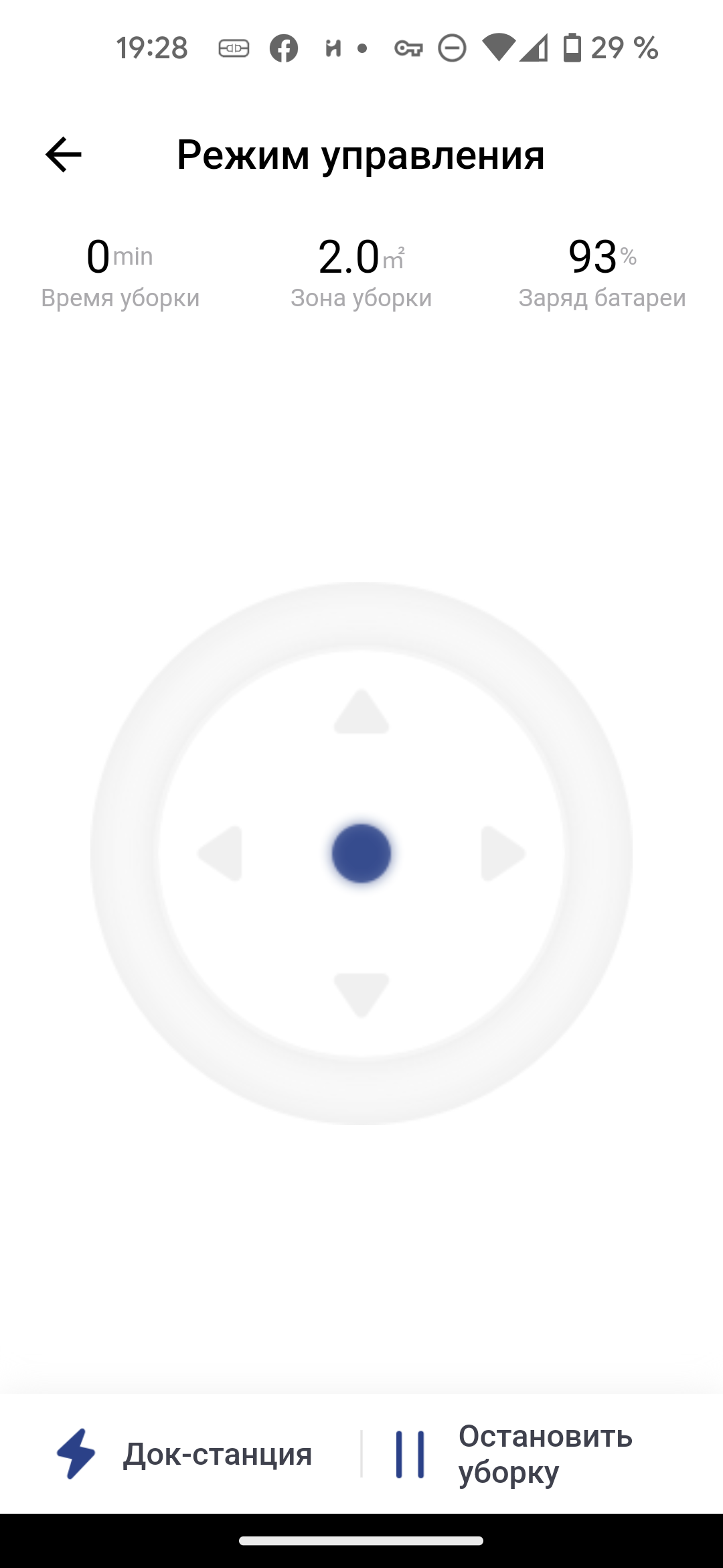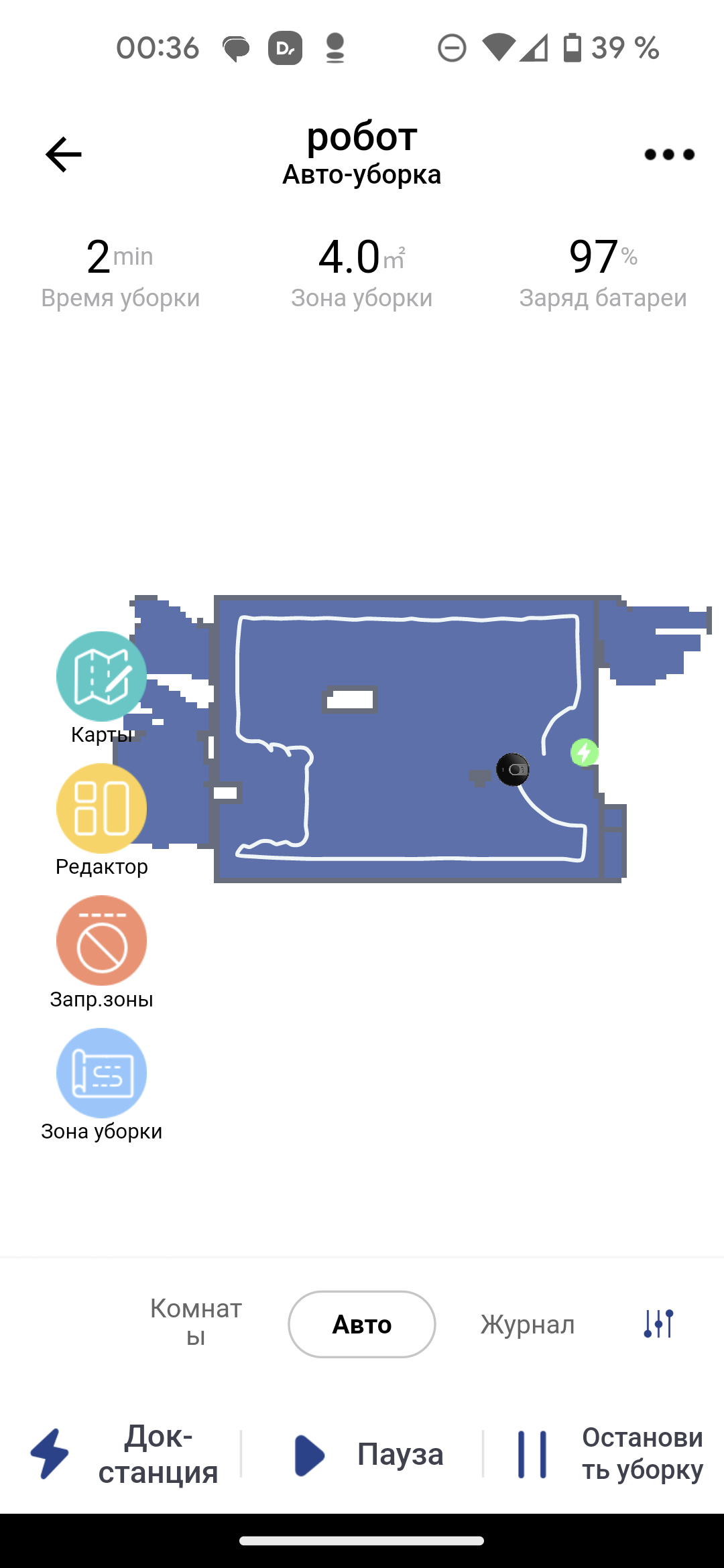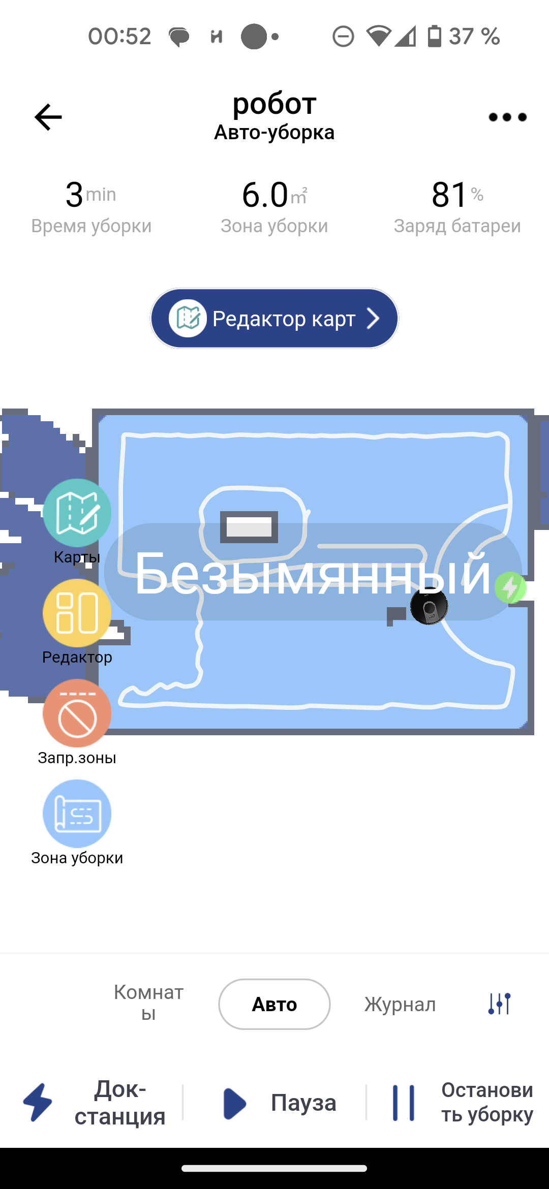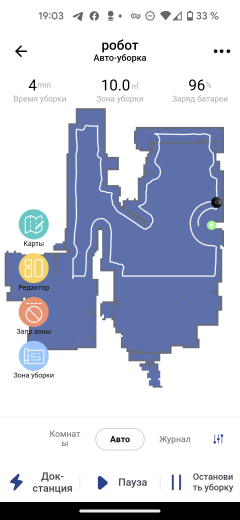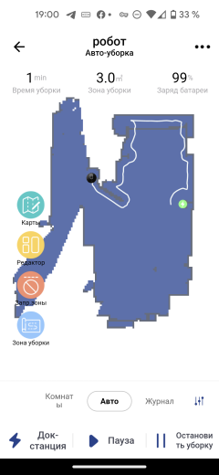 В центре главного экрана мы видим карту помещения, как его представляет себе робот. Для ее создания необходимо провести как минимум одну полную уборку всей квартиры (мы рассмотрим подробнее этот процесс в главе про эксплуатацию). Верх страницы отведен для данных о продолжительности текущей уборки, подметенной площади и актуального заряда аккумулятора в процентах. Кнопки в нижней части позволяют отправить пылесос на базу, приостановить или возобновить, а также прервать уборку.