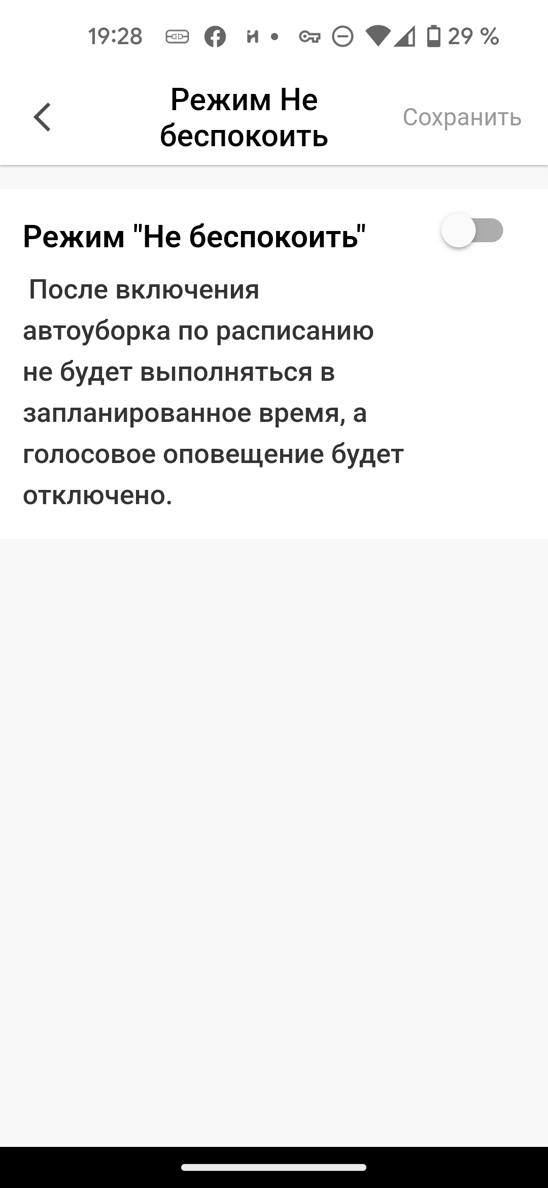 C помощью режима «Не беспокоить» можно установить время, когда пылесос не будет возобновлять прерванную уборку и присылать уведомления.