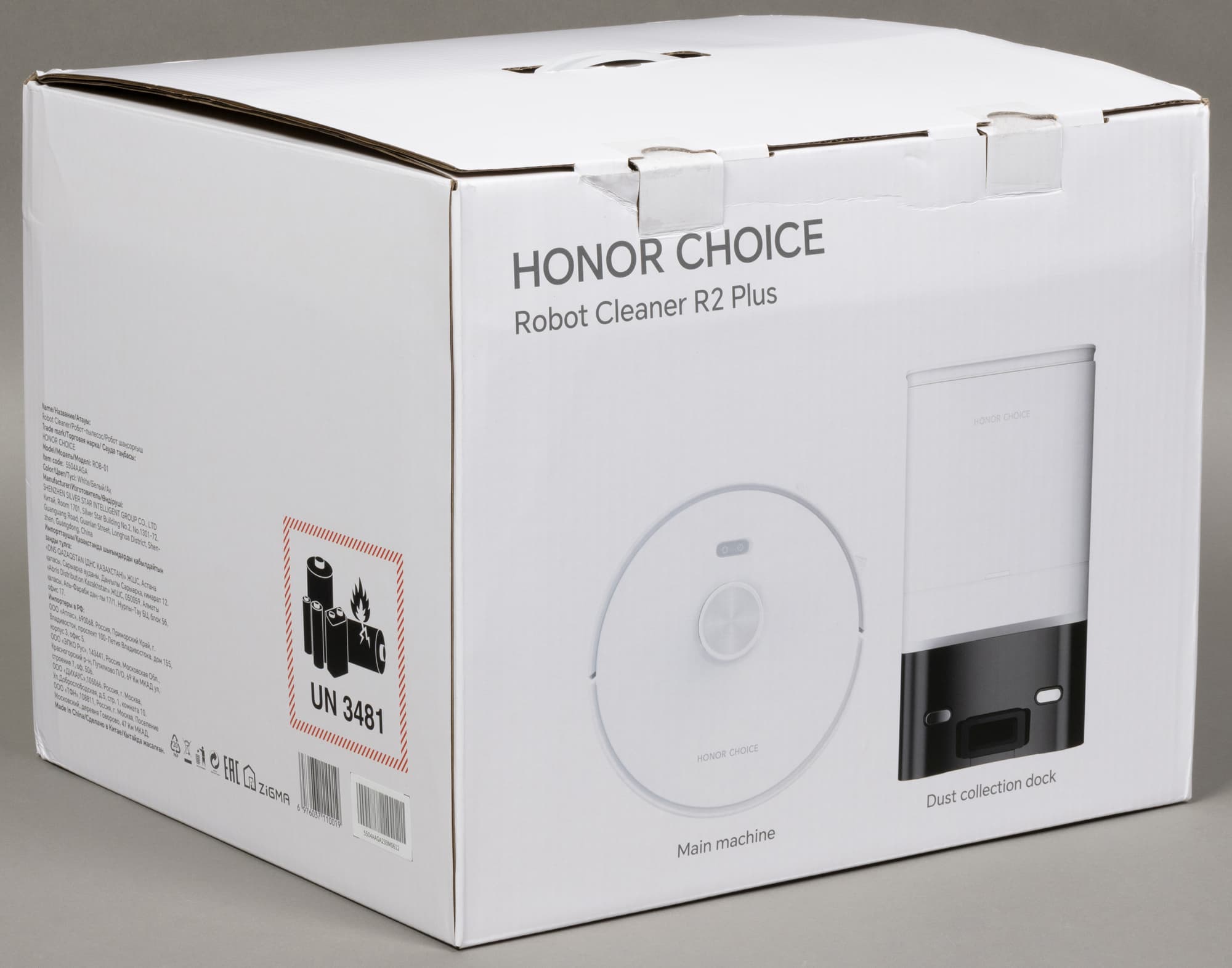 Внутренняя тара украшена изображениями робота и его базы для зарядки и самоочистки. На одной из боковых сторон кратко перечислены основные особенности модели, вторая отведена для контактов производителя, импортера и организации, ответственной за сбор претензий от потребителя.