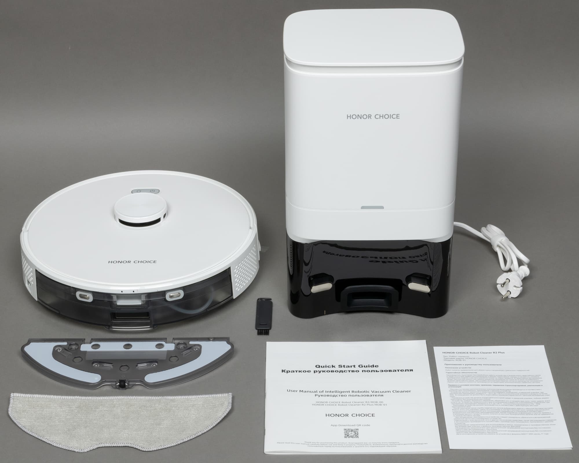 Комплектация Honor Choice Robot Cleaner R2 Plus позволяет сразу же приступить к использованию пылесоса, но никакого запаса расходных материалов ему не положено: нет даже сменных мешков для мусора.
