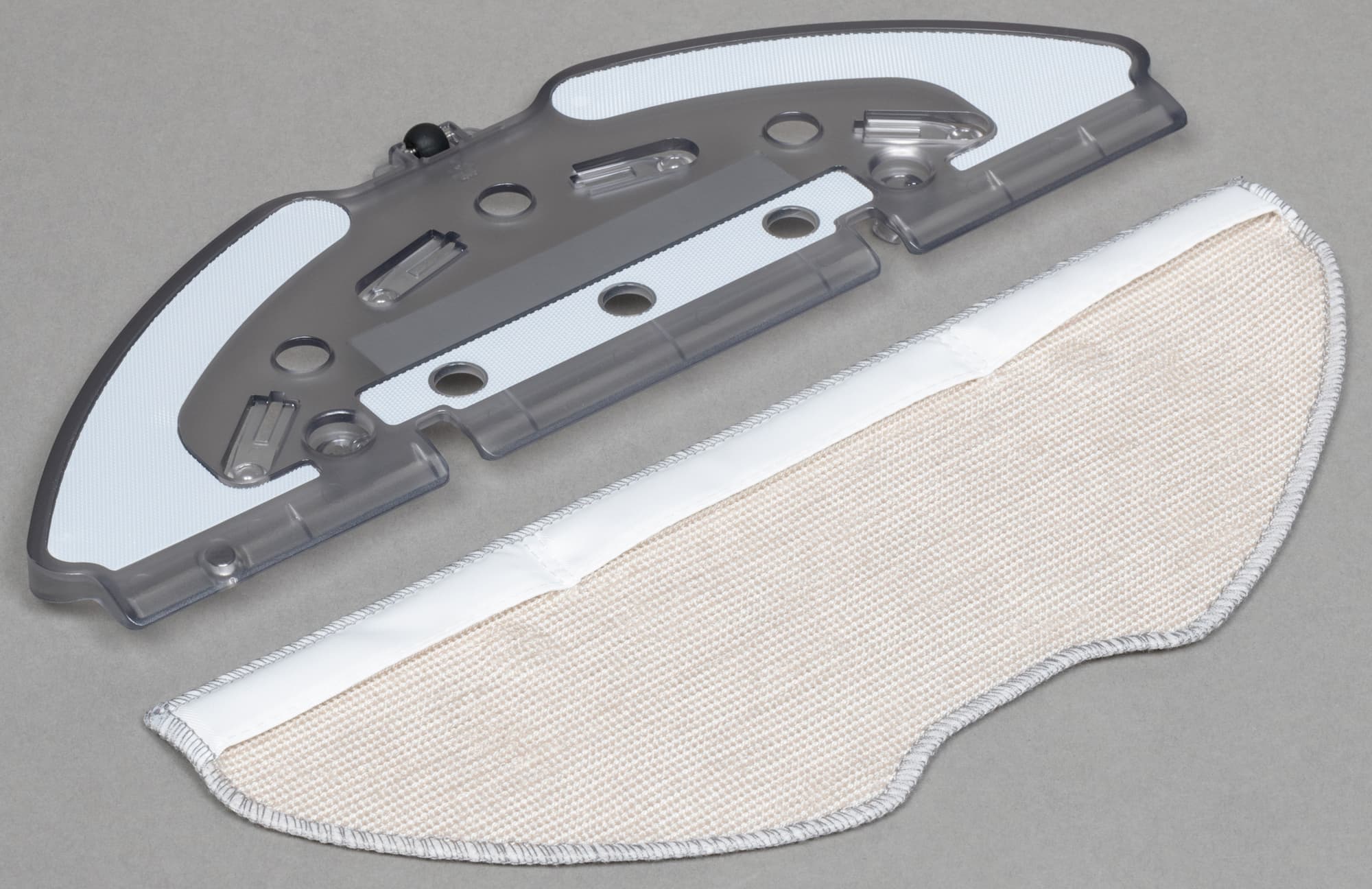 Кусок микрофибры сложной формы крепится к нижней части рамки с помощью липучек-велкро и дополнительно удерживается эластичным «карманом» белого цвета.