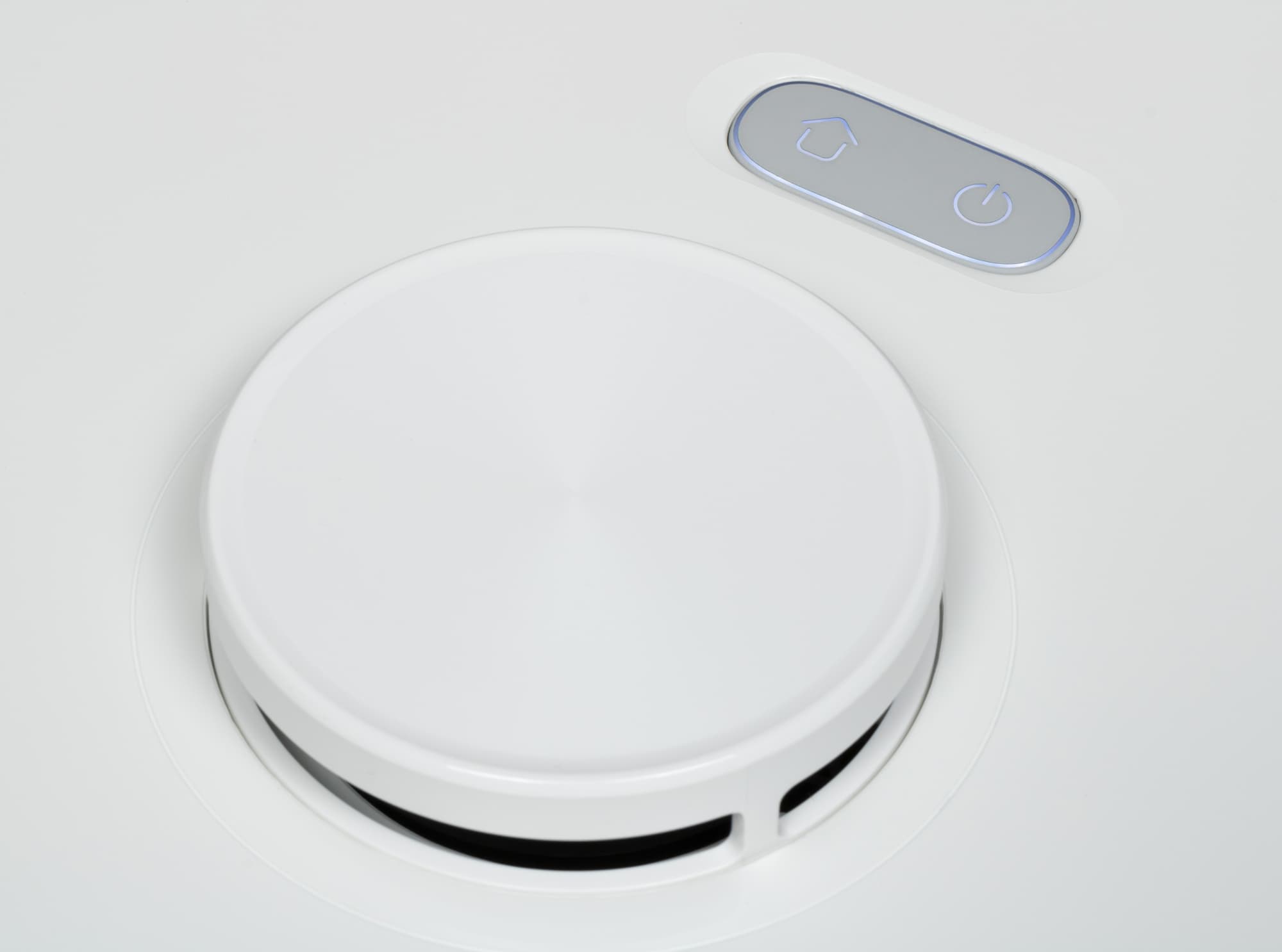 Первый включает пылесос и запускает уборку в автоматическом режиме, второй отправляет устройство на базу для зарядки и очистки. Длинное нажатие на обе кнопки включает режим сопряжения с мобильным телефоном.