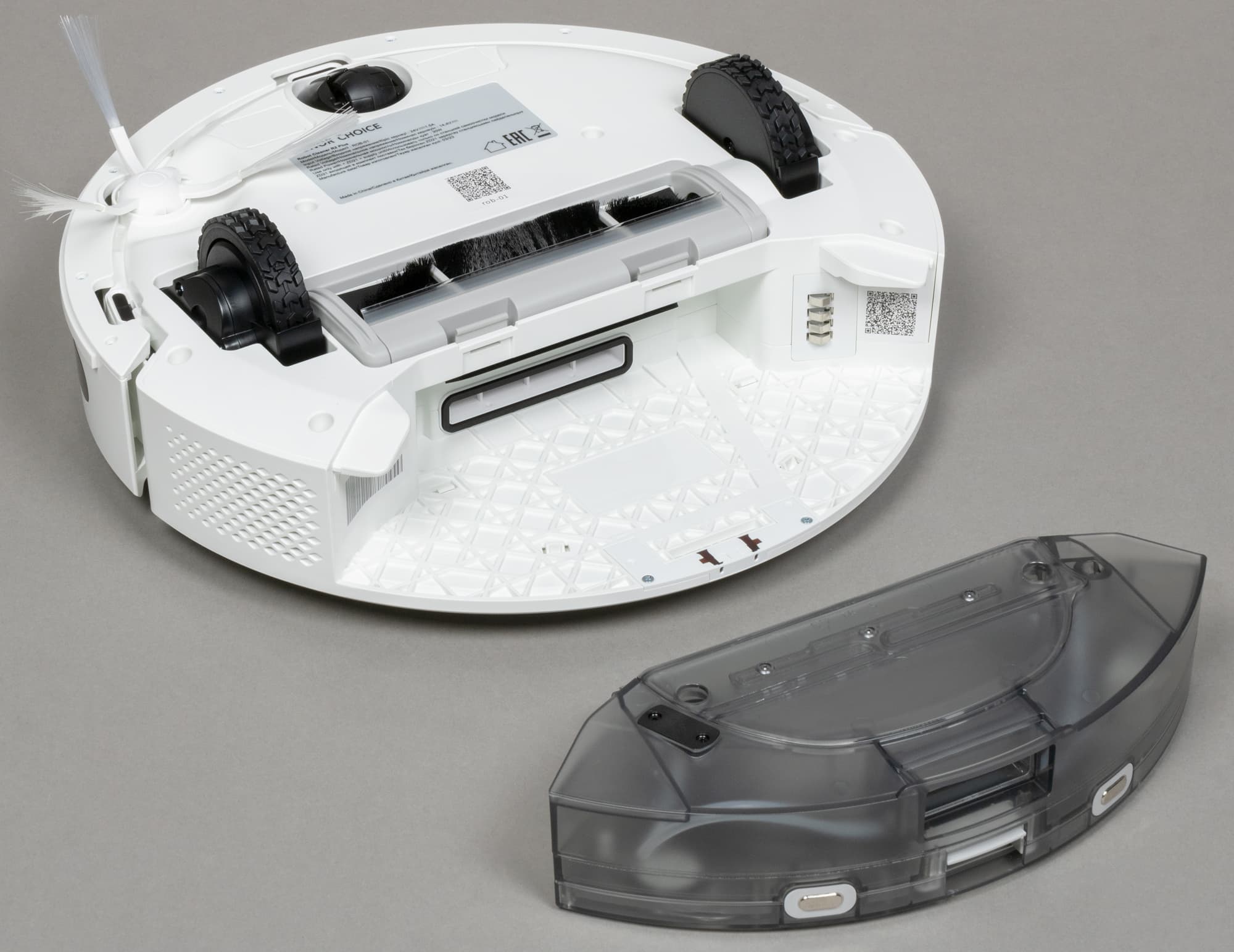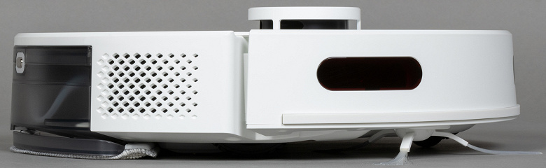 Единственный модуль, входящий в комплект, предназначен для комбинированной (сухой и влажной) уборки. Его отсек находится в задней части корпуса. На корме хорошо заметны два металлических контакта, обеспечивающие зарядку, и окошко для самоочистки, через которое базовая станция удаляет мусор из контейнера.