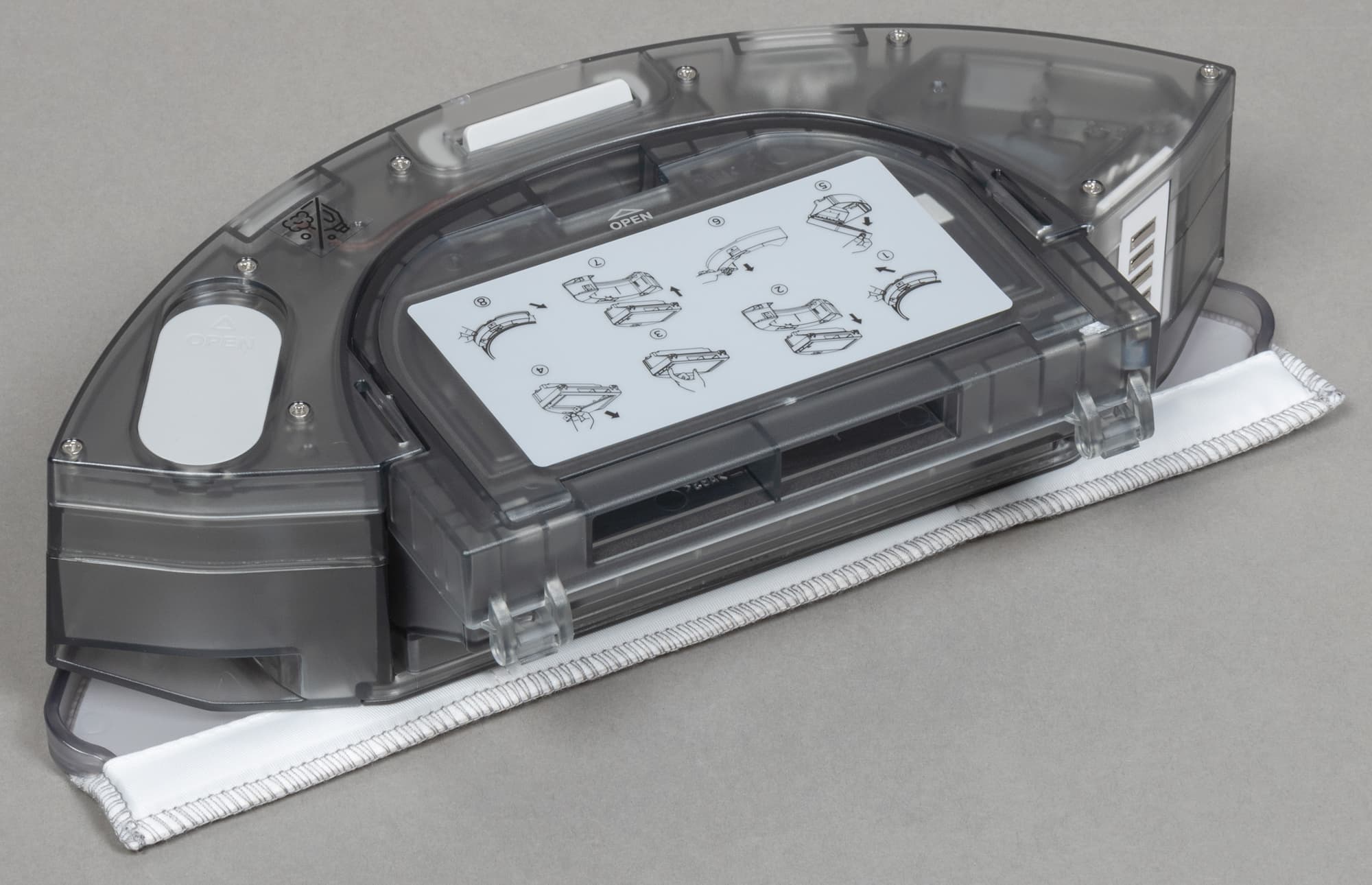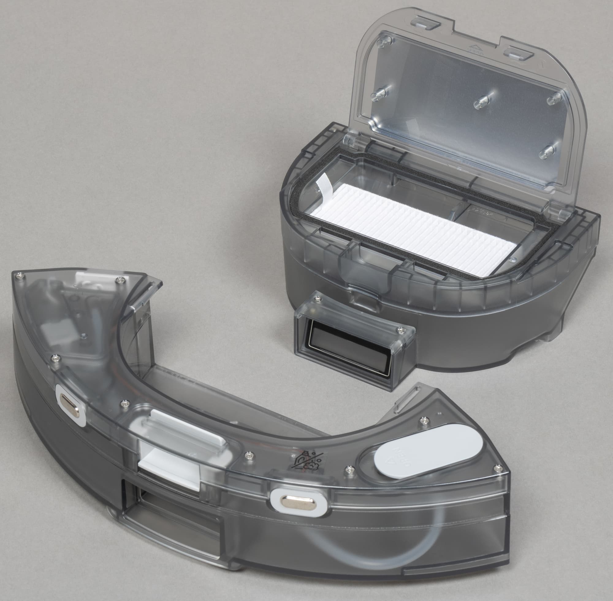 Внутри отсека для контейнера находятся четыре контактные пластины, соединяющие модуль с основным корпусом. Через две из них осуществляется зарядка устройства на базе, а вторая пара предназначена для питания миниатюрного насоса, подающего воду на рабочую поверхность во время влажной уборки.