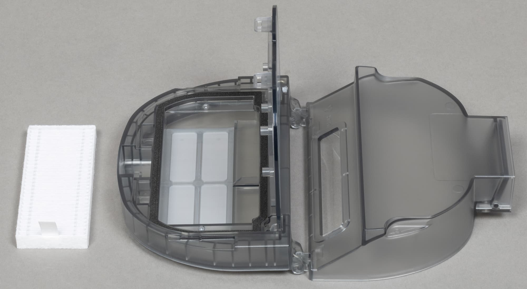 Система фильтрации у этой модели двуступенчатая: поток воздуха с пылью проходит через тонкую капроновую сетку, защищающую от повреждений основной элемент: прямоугольный HEPA-фильтр.