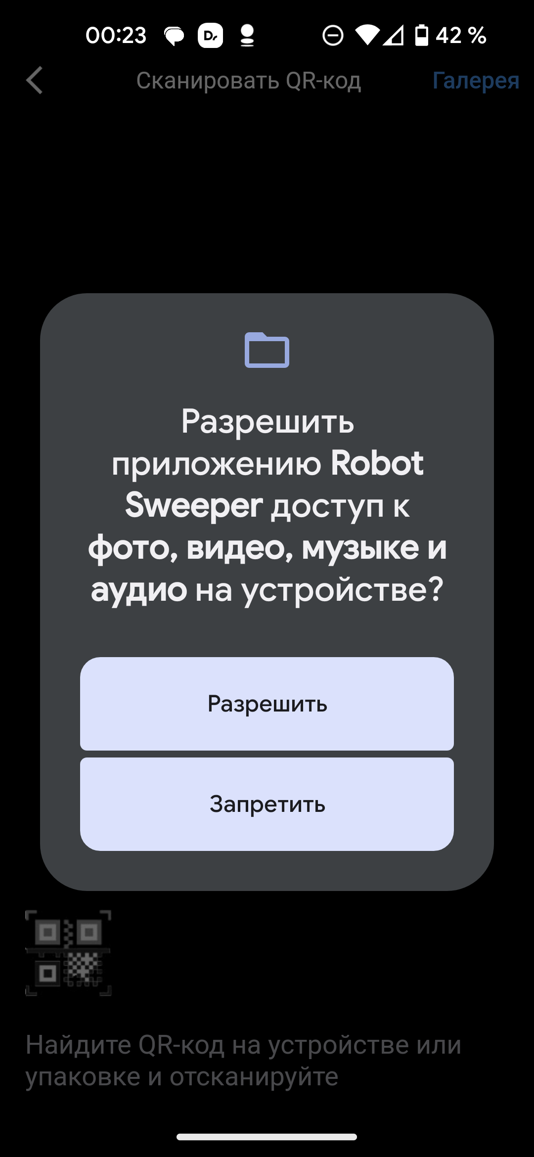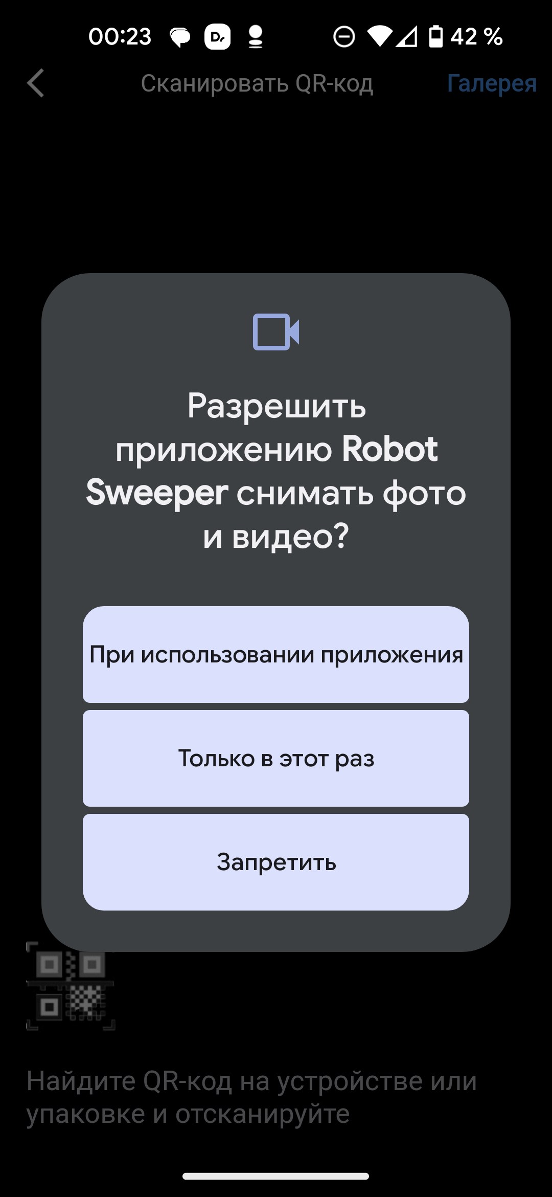 При нажатии кнопки «Добавить устройство» появляется также запрос на доступ к фотокамере и мультимедиа на устройстве. Это нужно для того, чтобы можно было отсканировать QR-код на корпусе и определить настраиваемую модель. Сразу после этого разрешение можно отозвать: больше оно не понадобится.