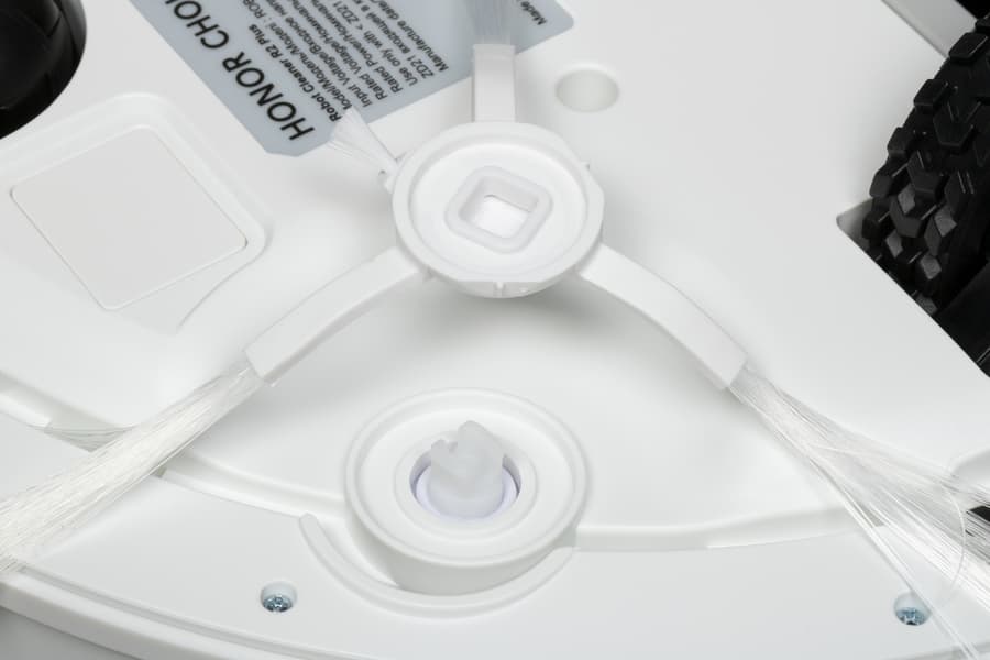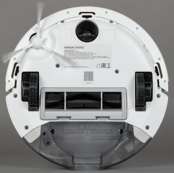 У ходовой части Honor Choice Robot Cleaner R2 Plus/ROB-01 традиционная компоновка: два ведущих колеса по бокам и сферическое опорное — в передней части. Подвеска ведущих имеет шаг от 8 до 33 мм — это позволяет роботу легко одолевать пороги и неровности покрытия. Сами колеса снабжены выраженным резиновым протектором, призванным исключать пробуксовку на гладком полу.