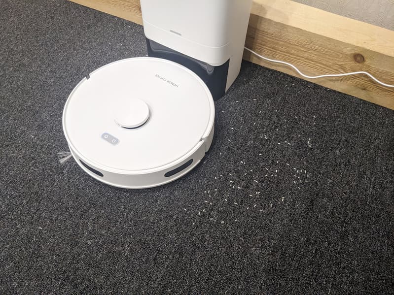 Чтобы посмотреть, можно ли улучшить этот результат, мы запустили пылесос в том же режиме второй раз. После этого на полу нашего тестового помещения мусора почти не осталось — за исключением небольшого участка непосредственно рядом с базой: ее прибор обходил полукругом с радиусом около 40 сантиметров.