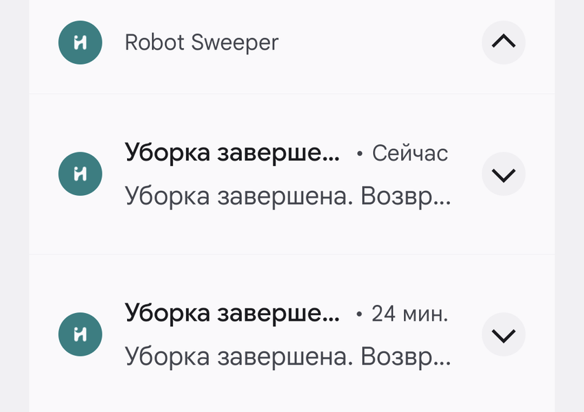 Об успешно завершенной уборке или неполадках в работе робот извещает пользователя голосом на русском, английском или китайском языке. Также на мобильный телефон приходит пуш-уведомление.
