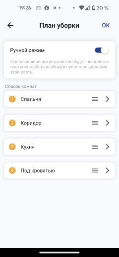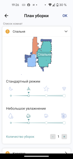 Он позволяет переименовать помещения, скорректировать их границы, настроить очередность уборки по комнатам, уровни мощности сухой и влажной уборки, а также количество проходов по помещению для каждой комнаты отдельно.