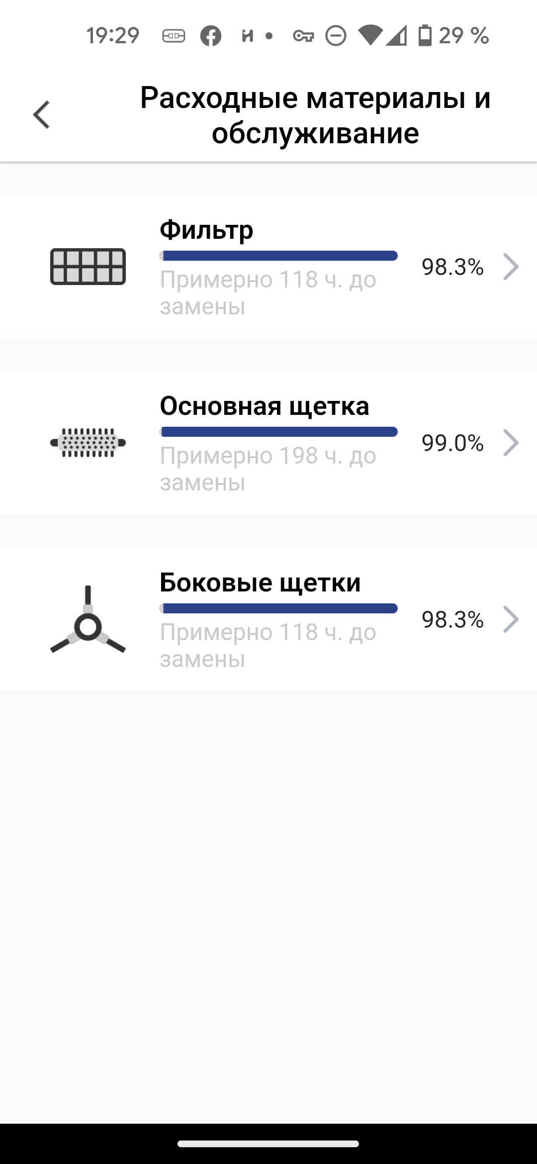 Пункт «Расходные материалы и обслуживание» предлагает узнать о ресурсе HEPA-фильтра и щеток — боковых и центральной. При замене расходников нужно обнулить сервисный интервал в приложении.